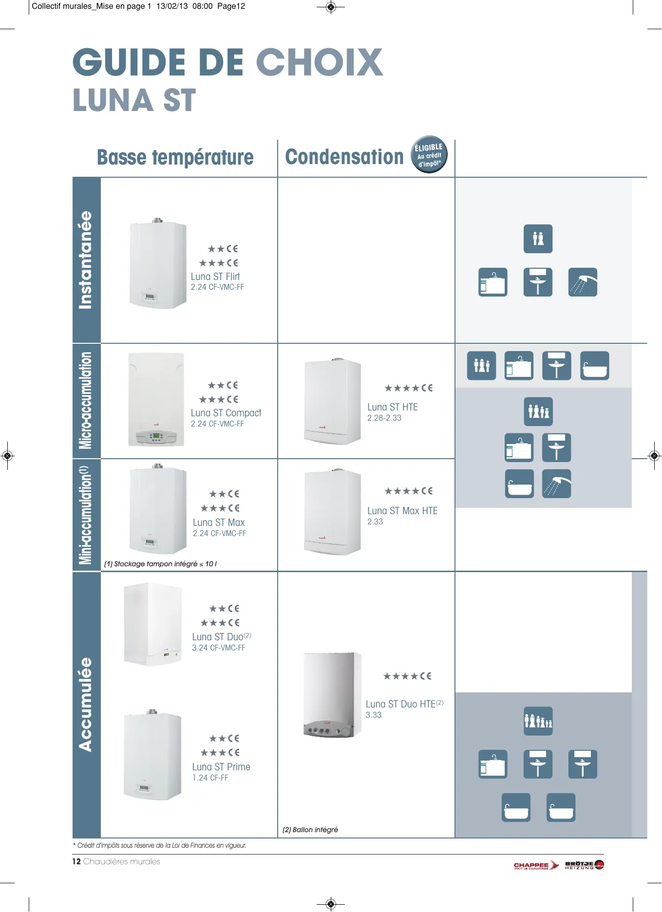 | Luna ST Flirt : | Chaudière gaz, chauffage et eau chaude sanitaire instantanée. Eau chaude immédiate à température constante Une prestation eau chaude haut de gamme à coût attractif | |