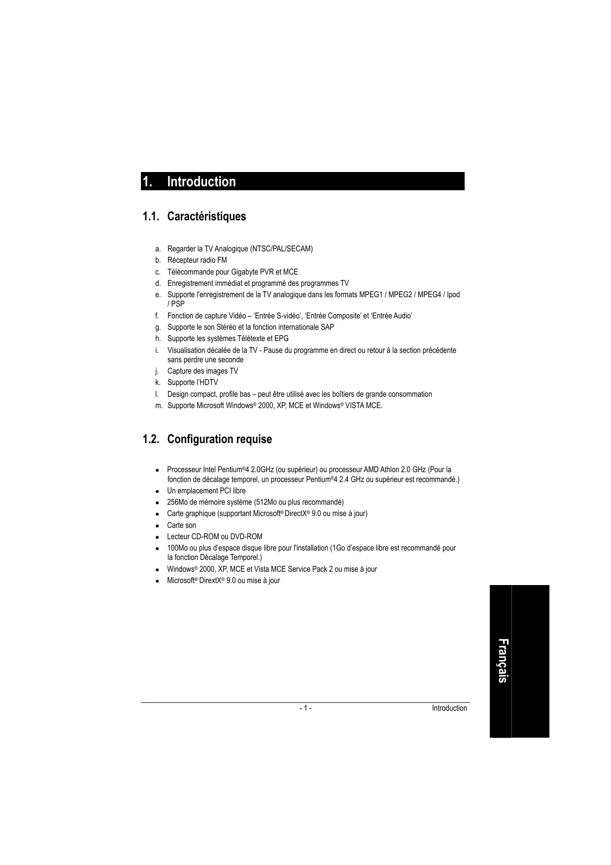 Regarder la TV Analogique (NTSC/PAL/SECAM) Récepteur radio FM Télécommande pour Gigabyte PVR et MCE Enregistrement immédiat et programmé des programmes TV Supporte l'enregistrement de la TV analogique dans les formats MPEG1 / MPEG2 / MPEG4 / Ipod / PSP Fonction de capture Vidéo – ‘Entrée S-vidéo’, ‘Entrée Composite’ et ‘Entrée Audio’ Supporte le son Stéréo et la fonction internationale SAP Supporte les systèmes Télétexte et EPG Visualisation décalée de la TV - Pause du programme en direct ou retour à la section précédente sans perdre une seconde Capture des images TV Supporte l’HDTV Design compact, profile bas – peut être utilisé avec les boîtiers de grande consommation Supporte Microsoft Windows® 2000, XP, MCE et Windows® VISTA MCE.