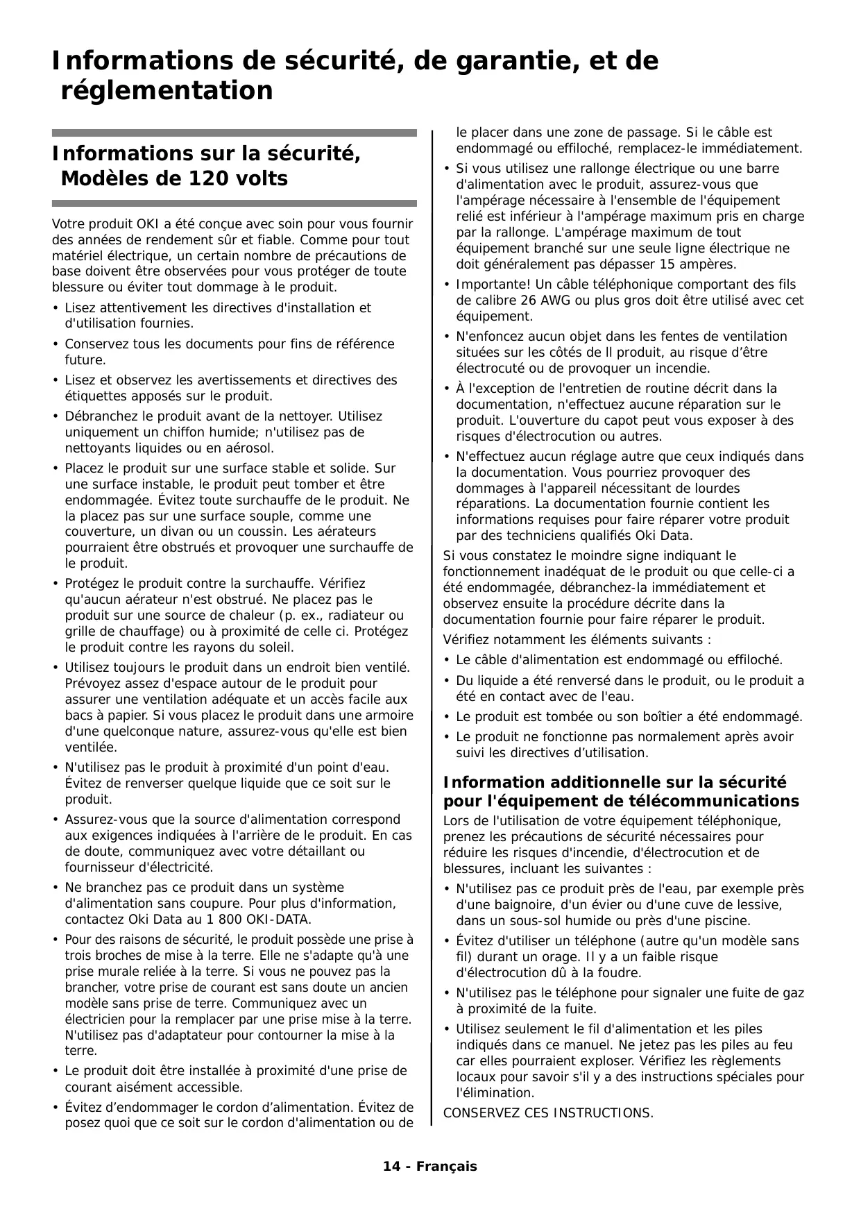 Informations de sécurité, de garantie, et de réglementation le placer dans une zone de passage. Si le câble est endommagé ou effiloché, remplacez-le immédiatement. Informations sur la sécurité, Modèles de 120 volts Votre produit OKI a été conçue avec soin pour vous fournir des années de rendement sûr et fiable. Comme pour tout matériel électrique, un certain nombre de précautions de base doivent être observées pour vous protéger de toute blessure ou éviter tout dommage à le produit.
