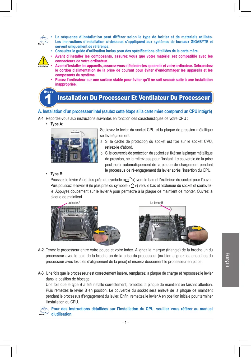 - • Type B: Poussez le levier A (le plus près du symbole « ») vers le bas et l'extérieur du socket pour l'ouvrir. Puis poussez le levier B (le plus près du symbole « ») vers le bas et l'extérieur du socket et soulevezle. Appuyez doucement sur le levier A pour permettre à la plaque de maintient de monter. Ouvrez la plaque de maintient. Le levier B Le levier A A-3 Une fois que le processeur est correctement inséré, remplacez la plaque de charge et repoussez le levier dans la position de blocage. Une fois que le type B a été installé correctement, remettez la plaque de maintient en faisant attention. Puis remettez le levier B en position. Le couvercle du socket sera enlevé de la plaque de maintient pendant le processus d'engagement du levier. Enfin, remettez le levier A en position initiale pour terminer l'installation du CPU. Pour des instructions détaillées sur l'installation du CPU, veuillez vous référer au manuel d'utilisation.