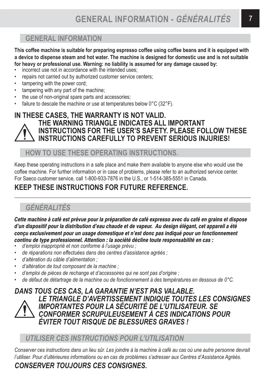 Conserver ces instructions dans un lieu sur. Les joindre à la machine à café au cas où une autre personne devrait l'utiliser. Pour d'ultérièures informations ou en cas de problèmes s'adresser aux Centres d'Assistance Agréés.