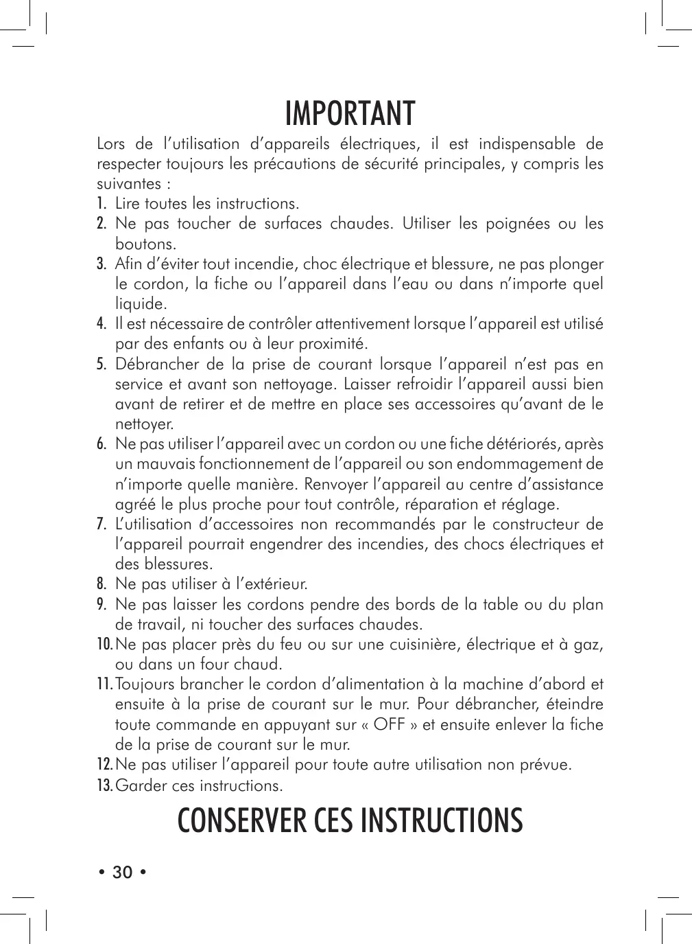 12.Ne pas utiliser l'appareil pour toute autre utilisation non prévue. 13. Garder ces instructions.
