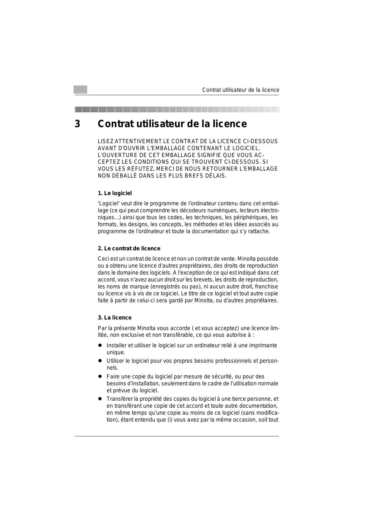 Contrat utilisateur de la licence transmis à cette tierce personne, soit détruit toutes vos autres copies du logiciel. (ii) Un tel transfert met fin à votre propre licence auprès de Minolta et (iii) donc, lie le nouveau propriétaire aux conditions de la li- cence dès le début de l'utilisation du logiciel.