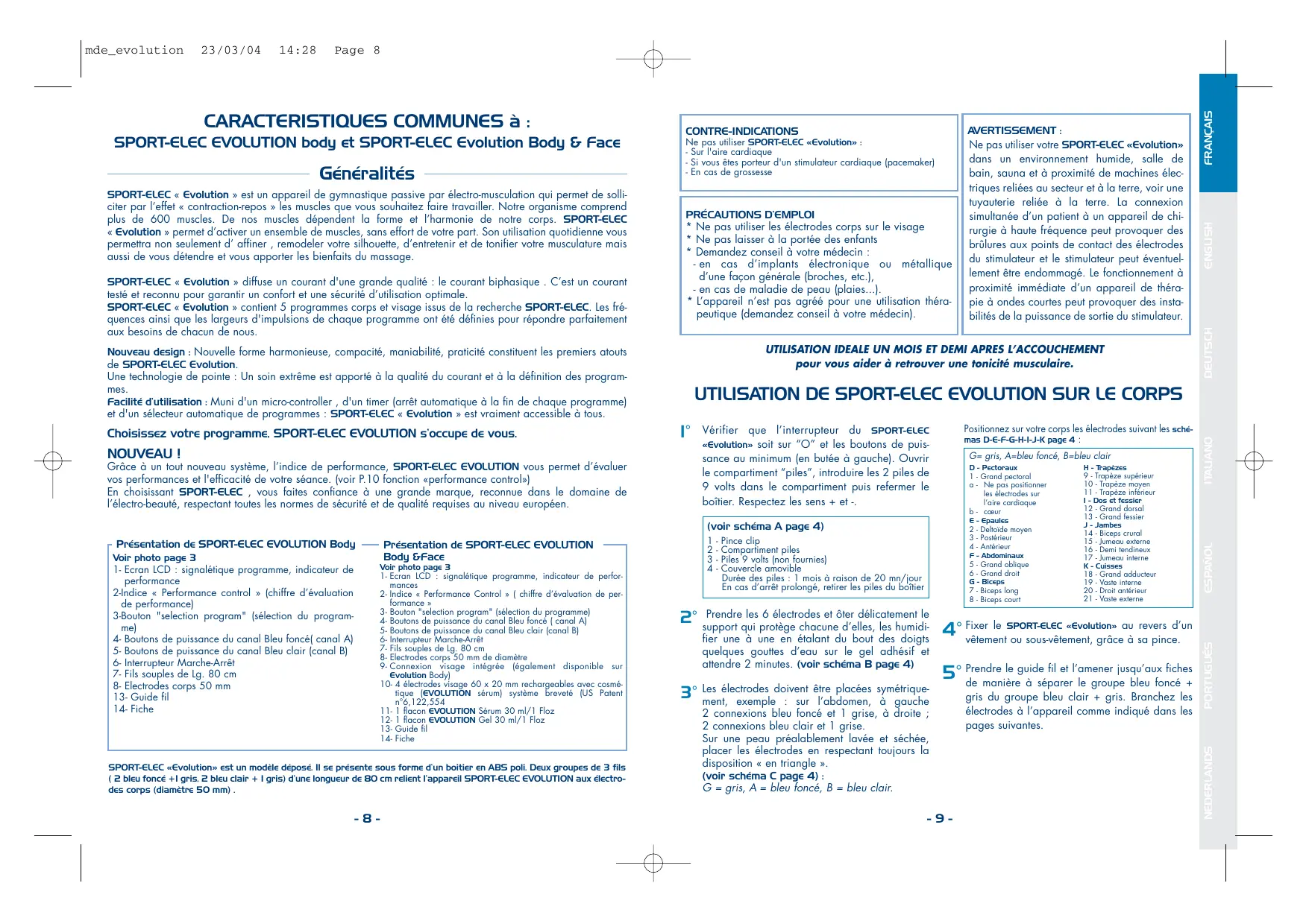 gris du groupe bleu clair + gris. Branchez les électrodes à l’appareil comme indiqué dans les pages suivantes. ITALIANO CARACTERISTIQUES COMMUNES à : SPORT-ELEC EVOLUTION body et SPORT-ELEC Evolution Body & Face FRANÇAIS Page 8 ESPAÑOL ESPAGNOL 14:28 PORTUGUÊS 23/03/04 NEDERLANDS mde_evolution BIEN-ETRE / ECHAUFFEMENT 20 Min pour échauffer vos muscles avant de faire du sport, ou vous détendre après un effort. STIMULATION FERMETE Ce programme de 40min offre la possibilité de raffermir efficacement votre corps à la suite d'une période d'inactivité, et d'entretenir la fermeté de votre corps.
