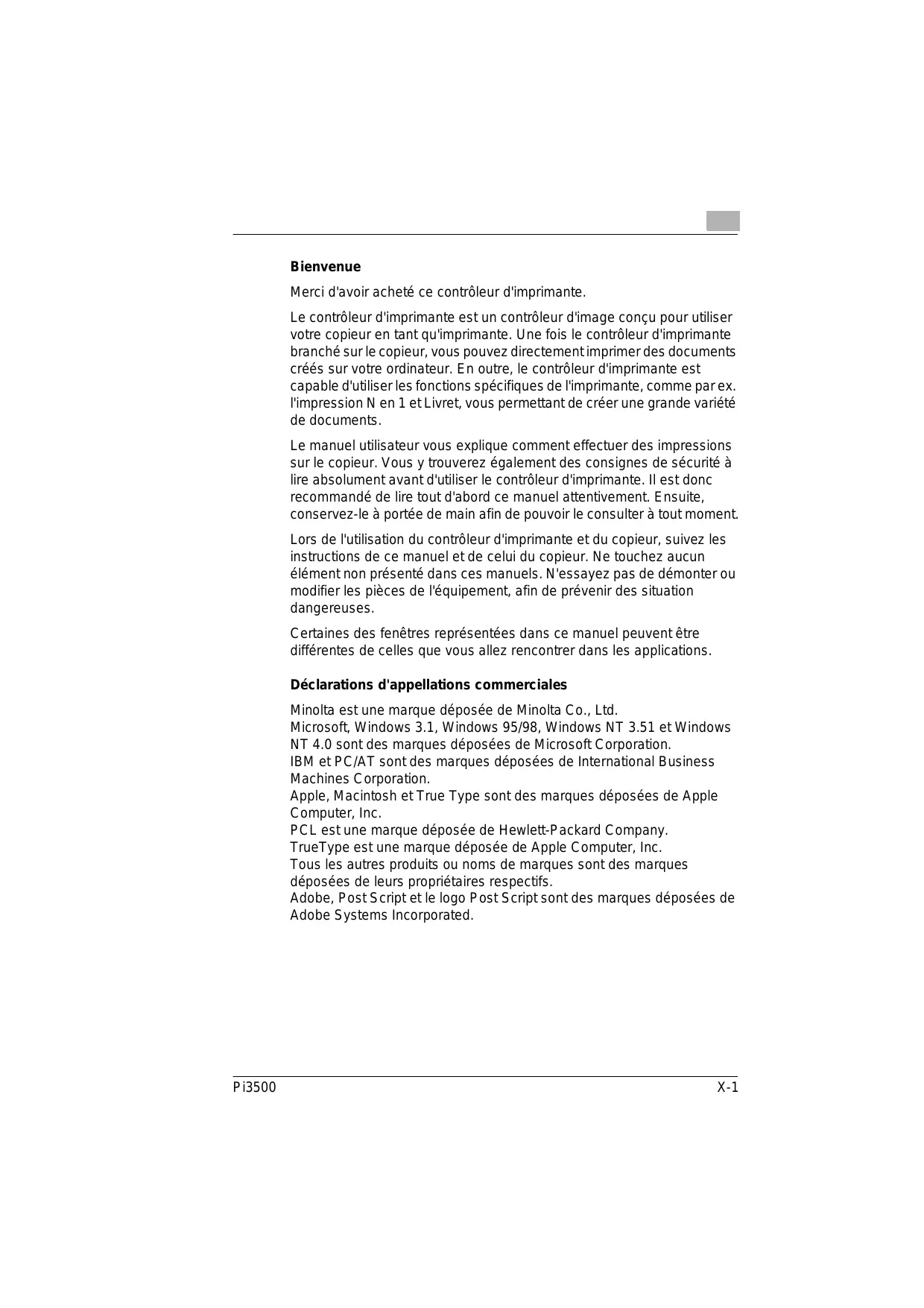Pi3500 Pi3500 Bienvenue Merci d'avoir acheté ce contrôleur d'imprimante. Le contrôleur d'imprimante est un contrôleur d'image conçu pour utiliser votre copieur en tant qu'imprimante. Une fois le contrôleur d'imprimante branché sur le copieur, vous pouvez directement imprimer des documents créés sur votre ordinateur. En outre, le contrôleur d'imprimante est capable d'utiliser les fonctions spécifiques de l'imprimante, comme par ex. l'impression N en 1 et Livret, vous permettant de créer une grande variété de documents. Le manuel utilisateur vous explique comment effectuer des impressions sur le copieur. Vous y trouverez également des consignes de sécurité à lire absolument avant d'utiliser le contrôleur d'imprimante. Il est donc recommandé de lire tout d'abord ce manuel attentivement. Ensuite, conservez-le à portée de main afin de pouvoir le consulter à tout moment. Lors de l'utilisation du contrôleur d'imprimante et du copieur, suivez les instructions de ce manuel et de celui du copieur. Ne touchez aucun élément non présenté dans ces manuels. N'essayez pas de démonter ou modifier les pièces de l'équipement, afin de prévenir des situation dangereuses. Certaines des fenêtres représentées dans ce manuel peuvent être différentes de celles que vous allez rencontrer dans les applications. Déclarations d'appellations commerciales Minolta est une marque déposée de Minolta Co., Ltd. Microsoft, Windows 3.1, Windows 95/98, Windows NT 3.51 et Windows NT 4.0 sont des marques déposées de Microsoft Corporation. IBM et PC/AT sont des marques déposées de International Business Machines Corporation. Apple, Macintosh et True Type sont des marques déposées de Apple Computer, Inc. PCL est une marque déposée de Hewlett-Packard Company. TrueType est une marque déposée de Apple Computer, Inc. Tous les autres produits ou noms de marques sont des marques déposées de leurs propriétaires respectifs. Adobe, Post Script et le logo Post Script sont des marques déposées de Adobe Systems Incorporated. Pi3500 X-1 Symbole CE (déclaration de conformité) Nous déclarons sous notre entière responsabilité, que le copieur et les options concernés par cette déclaration sont en conformité avec les caractéristiques ci-dessous. Cette déclaration ne s'applique qu'aux pays de l'Union européenne (UE). Type de produit Appareil multifonctions Nom du produit Di250/Di350 + contrôleur d'imprimante Pi3500 Options Di250/Di350 AFR-14, AF-6 (uniquement Di250), AF-7 (uniquement Di350), FN-100, FN-500, PF-106, PF-108, PF-110, OT-100 (uniquement Di250), JS-200, AD-10 (uniquement Di250), DT-103, 16 Mo de mémoire, 32 Mo de mémoire Pi3500 Options Pi3500 4179-462 (disque dur), 4179-422 (10 Base-T/2), 4179-432 (10/100 Base-T), 4179-442 (Token Ring) 32 Mo de mémoire, 64 Mo de mémoire Standards