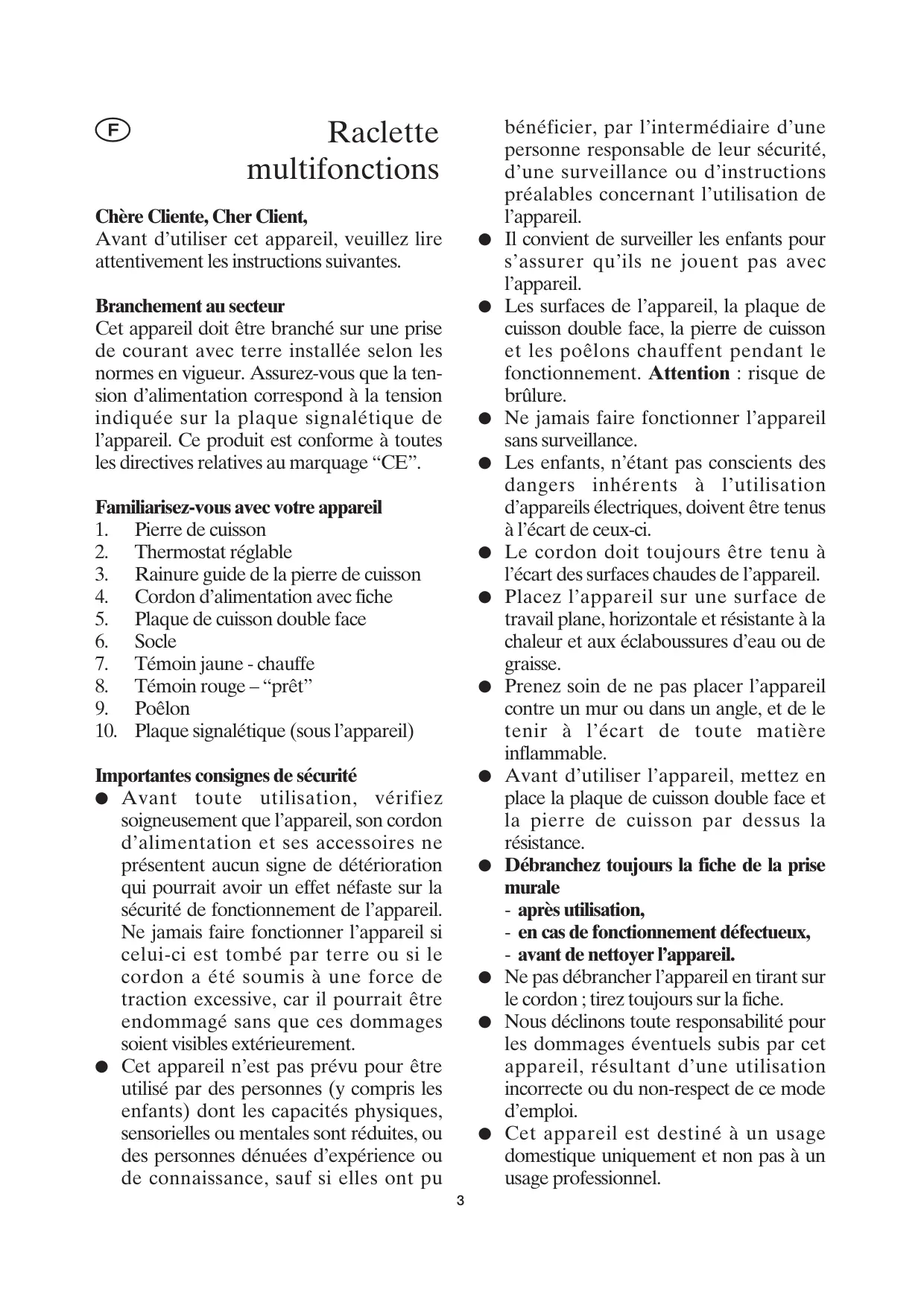 Raclette multifonctions Chère Cliente, Cher Client, Avant d’utiliser cet appareil, veuillez lire attentivement les instructions suivantes.