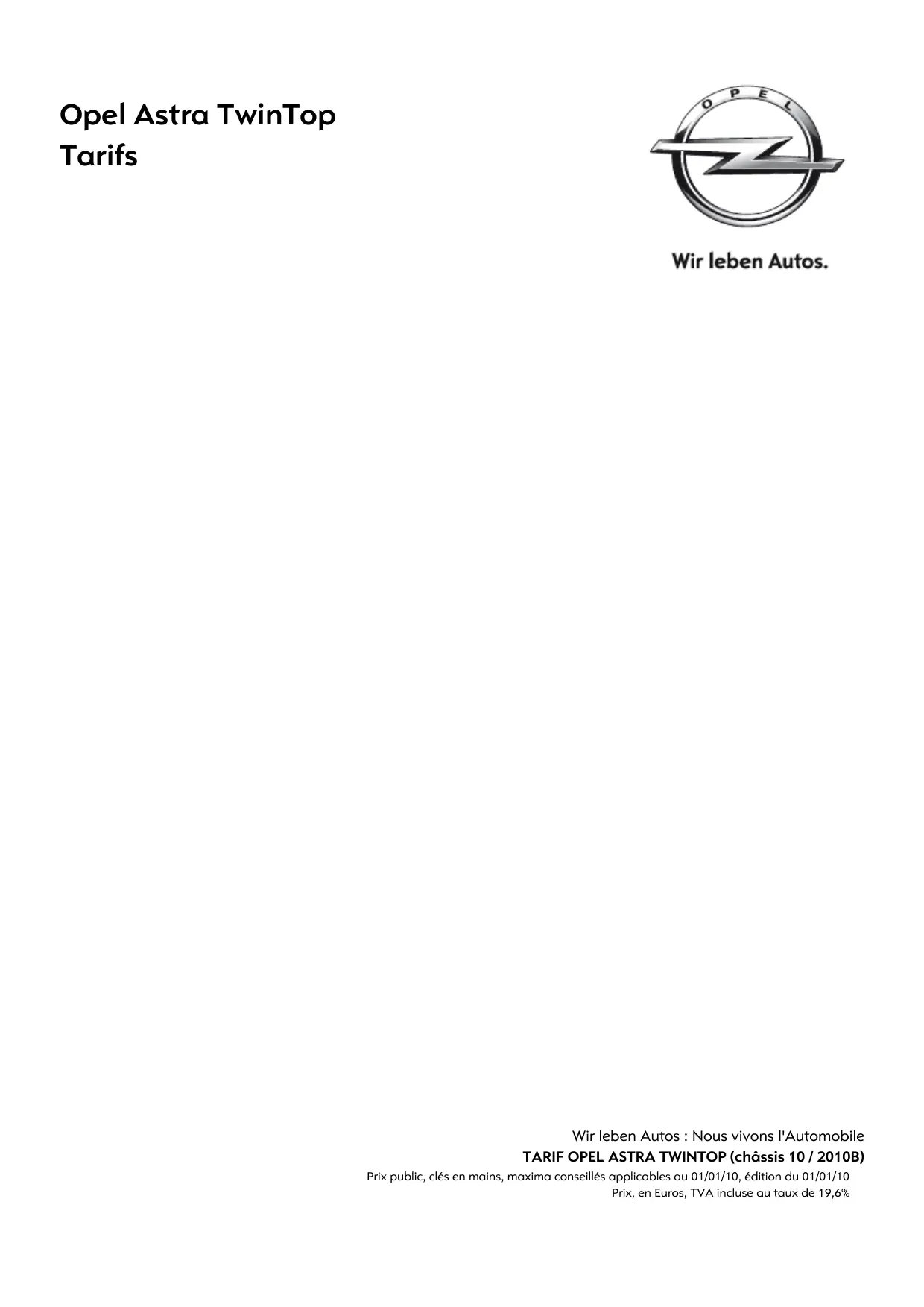 Le prix public "Clé en main" comprend le transport jusqu'au distributeur en France métropole et la préparation à la route incluant fourniture et pose d'un jeu de plaques d'immatriculation ainsi que 5 litres de carburant La carte grise est à la charge du client. Ces prix et spécifications peuvent être changés sans préavis et ne constituent pas une offre ferme. TARIF OPEL ASTRA TWINTOP (châssis 10 / 2010B) Prix public, clés en mains, maxima conseillés applicables au 01/01/10, édition du 01/01/10 Prix, en Euros, TVA incluse au taux de 19,6%