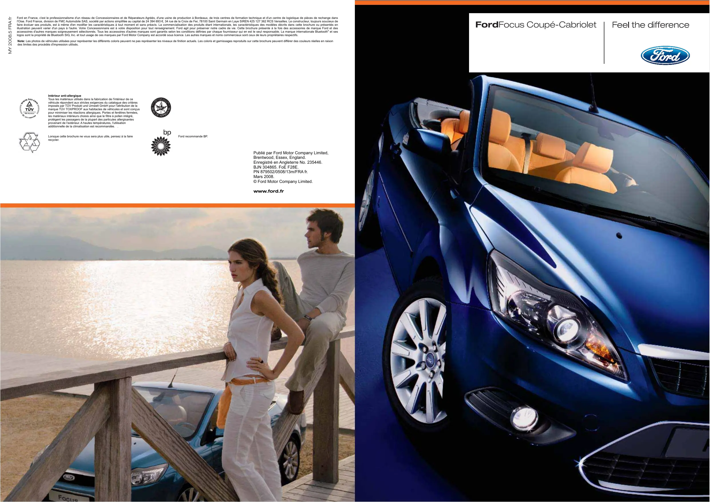 MY 2008.5 FRA fr Ford en France, c'est le professionnalisme d'un réseau de Concessionnaires et de Réparateurs Agréés, d'une usine de production à Bordeaux, de trois centres de formation technique et d'un centre de logistique de pièces de rechange dans l'Oise. Ford France, division de FMC Automobile SAS, société par actions simplifiée au capital de 24 394 693 €, 34 rue de la Croix de Fer, 78100 Saint Germain en Laye SIREN 425 127 362 RCS Versailles. Le constructeur, toujours soucieux de faire évoluer ses produits, est à même d'en modifier les caractéristiques à tout moment et sans préavis. La commercialisation des produits étant internationale, les caractéristiques des modèles décrits dans cette brochure ou présentés en illustration peuvent varier d'un pays à l'autre. Votre Concessionnaire est à votre disposition pour tout renseignement. Ford agit pour préserver notre cadre de vie. Cette brochure présente à la fois des accessoires de marque Ford et des accessoires d'autres marques soigneusement sélectionnés. Tous les accessoires d'autres marques sont garantis selon les conditions définies par chaque fournisseur qui en est le seul responsable. La marque internationale Bluetooth® et ses logos sont la propriété de Bluetooth SIG, Inc. et tout usage de ces marques par Ford Motor Company est accordé sous licence. Les autres marques et noms commerciaux sont ceux de leurs propriétaires respectifs. Note: Les photos de véhicules utilisées pour représenter les différents coloris peuvent ne pas représenter les niveaux de finition actuels. Les coloris et garnissages reproduits sur cette brochure peuvent différer des couleurs réelles en raison des limites des procédés d'impression utilisés. Intérieur anti-allergique Tous les matériaux utilisés dans la fabrication de l'intérieur de ce véhicule répondent aux strictes exigences du catalogue des critères imposés par TÜV Produkt und Umwelt GmbH pour l'attribution de la marque TÜV TOXPROOF aux habitacles de véhicules et sont conçus pour minimiser les réactions allergiques. Portes et fenêtres fermées, les matériaux intérieurs choisis ainsi que le filtre à pollen intégré, protègent les passagers de la plupart des particules allergisantes provenant de l'extérieur. A hautes températures, l'utilisation additionnelle de la climatisation est recommandée. . Lorsque cette brochure ne vous sera plus utile, pensez à la faire recycler. Ford recommande BP. Publié par Ford Motor Company Limited, Brentwood, Essex, England. Enregistré en Angleterre No. 235446. BJN 304865. FoE F28E. PN 879502/0508/13m/FRA fr. Mars 2008. © Ford Motor Company Limited. www.ford.fr FordFocus Coupé-Cabriolet A moins d'en avoir fait soi-même l'expérience, la description d'un sentiment amoureux ne pourra jamais correspondre exactement à ce qu'il nous fait vivre dans l'instant. Subtile alchimie, il mélange une sensation de plénitude à une profonde attirance que l'on éprouve dès le premier regard. La fluidité d'un coupé et l'élégance d'un cabriolet ... ... deux bonnes raisons d'en tomber amoureux. Il y a tout à parier que vous serez envahi par de tels sentiments quand vous découvrirez les lignes à la fois racées et élégantes de la nouvelle Ford Focus Coupé-Cabriolet. Technologique et séductrice, elle suscite une émotion immédiate tant par son style unique que par sa tenue de route irréprochable. Synonyme de design et de passion, la célèbre maison italienne Pininfarina a sculpté la carrosserie de la Focus Coupé-Cabriolet pour en faire un véritable objet de désir. Faire l'expérience de la sensualité du design d'un véhicule n'est rien si vous n'en prenez pas pleinement conscience à son bord. C'est au fil des kilomètres, les cheveux au vent ou protégés des intempéries selon vos envies, que vous découvrirez tout le potentiel de la Ford Focus Coupé-Cabriolet, dont le chassis et les motorisations concilient confort et plaisir de conduite. Racée et élégante, la Ford Focus CoupéCabriolet vous invite à un voyage chargé en émotions. Les lignes racées d’un coupé Le design raffiné d’un cabriolet Un plaisir de conduire partagé Laissez-vous séduire Prenez place à bord de votre coupé et découvrez, virage après virage, sa tenue de route exceptionnelle. A la moindre apparition d’un rayon de soleil, métamorphosezle en un séduisant cabriolet. Vous tombez alors sous le charme d’un voyage ouvert sur le monde. Votre cabriolet vous permet à son tour de profiter pleinement de votre trajet, tout en savourant la vie au grand air. Le style et l’élégance de votre coupé-cabriolet ne séduira pas seulement les passants que vous croiserez sur votre chemin : le soin du détail apporté à sa finition intérieure est en effet le reflet de son design extérieur. Laissez-vous envoûter Avec elle, vous ne faites aucun compromis. Voiture plaisir, elle sait vous offrir tout le confort que vous êtes en droit d’attendre. Vous partez à la dernière minute ? N’hésitez plus, votre Focus Coupé-Cabriolet dispose de quatre vraies places et d’un espace généreux pour tous vos bagages. Le confort à bord n’a d’égal que le plaisir de la conduire. Son raffinement intérieur vous projette dans un monde de luxe et de bien-être. Et pour plus de confort, goûtez aux dernières technologies proposées en option : la technologie Bluetooth® pour utiliser votre téléphone portable sans quitter le volant des mains, ou encore le système de navigation avec écran couleur tactile pour vous mener toujours à bon port. Laissez-vous guider par vos émotions : jamais un coupé-cabriolet ne vous aura donné autant de sensations. Systèmes audio Sony Système audio CD MP3 et système audio 6 CD en facade. Ces deux systèmes disposent d'un port auxiliaire pour votre lecteur MP3. Bénéficiez du savoir-faire Sony sur votre Ford Focus Coupé-Cabriolet. Système à commandes vocales et technologie sans fil Bl