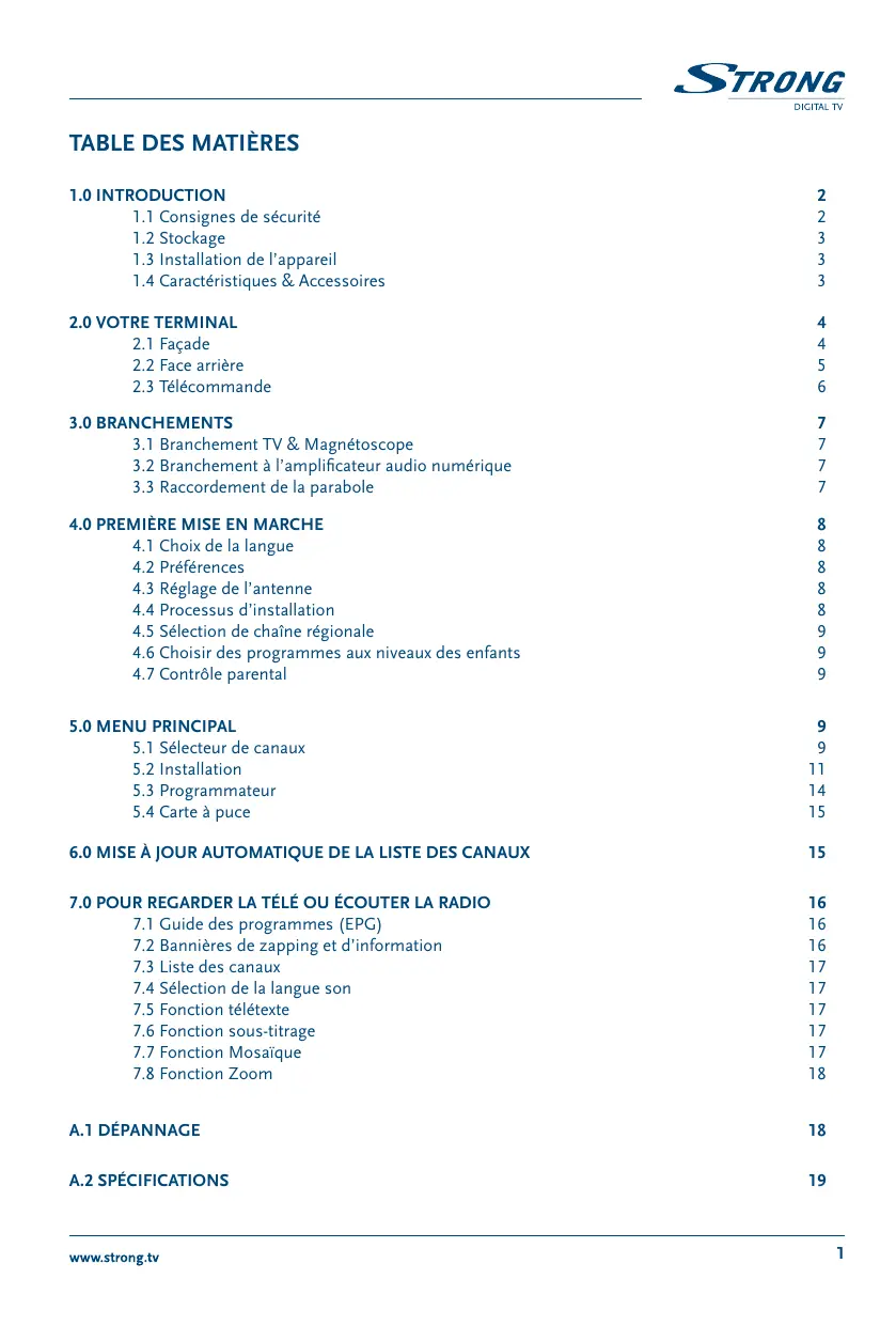 Le terminal est conforme à la norme EN 60065. STRONG déclare que ce point est conforme aux exigences de base et aux autres dispositions et directives applicables CE 2004/108/EEC et 73/23EEC RoHS 2002/95EEC Sujet à modification. En conséquence de la recherche et du développement continus, les spécificités techniques, le design et l’apparence du produit peuvent changer. ASTRA est une marque déposée de SES ASTRA, TNTSAT est une marque de CANALSAT, Viaccess est une marque de Viaccess, tous les autres produits sont des marques ou des marques déposées de leurs propriétaires respectifs. © STRONG 2010. Tous droits réservés. 01/2010 1p20 14 Jan 2010 17:45