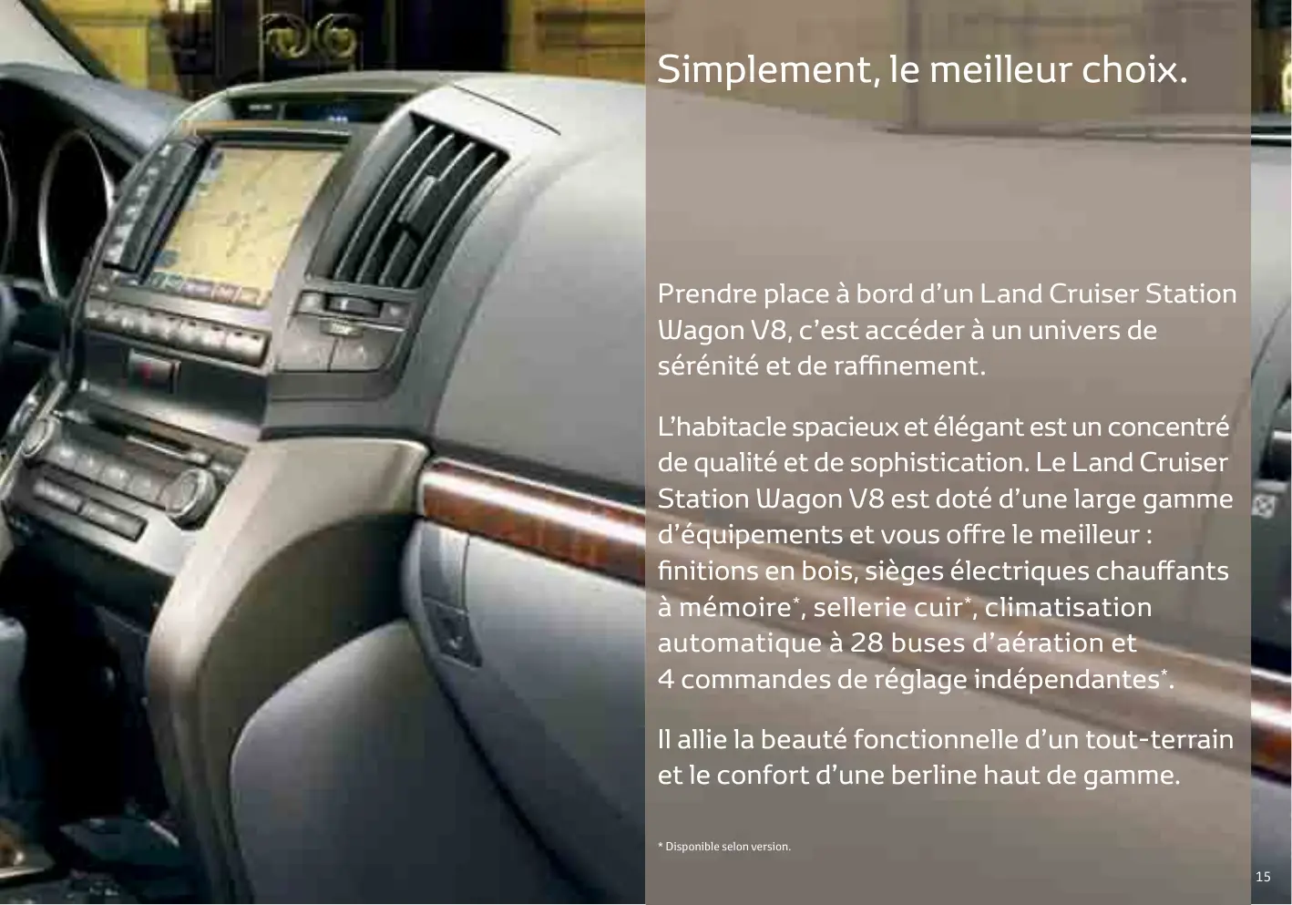 Pour en savoir plus sur le Land Cruiser Station QD Wagon V8, rendez-vous sur notre site : TOYOTA toyota.fr/landcruiserswv8 ImporteirDistibutenrerclusif Toyota reffte -20 boulevard dela République 92420 Vaucresson: Tél/:0147 108100» Société par Actibns Simplifiée au capital dé 212312/Eur08 -Tod 12034040 RCEMNanteree Birét 712 034040 00 154. Leskestacténistiiée ét équipements des modèles présentée dans cetiebrochtre sonbddnnés Etre fndieatif Lesepéciieston "1oday (hoïdsLétidimensions)Ipeuvent varier selon l'évolution des produits MroVotalFrahce sesrésetyelleldroit derles motifieransipréaVie LeeMtechniques d'impresaon peuvent T modiferlégèrement les couleursréelles (Photos non contractuelles) © TaÿotalRCS Nanteret712034040- AgencelROISE! RCS Paris B.908)610 810 2 omorrowW Photothèque TOYOTA - Réf, FNGPU A0180 - 02/2010 - 25 000 6xe foutereproductiontintéraite & Toyota Alu dhul demain