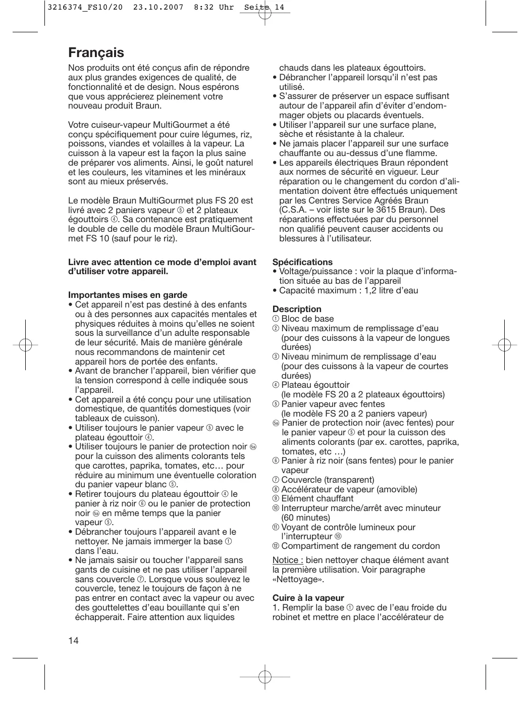 8:32 Uhr Seite 14 Français Nos produits ont été conçus afin de répondre aux plus grandes exigences de qualité, de fonctionnalité et de design. Nous espérons que vous apprécierez pleinement votre nouveau produit Braun. Votre cuiseur-vapeur MultiGourmet a été conçu spécifiquement pour cuire légumes, riz, poissons, viandes et volailles à la vapeur. La cuisson à la vapeur est la façon la plus saine de préparer vos aliments. Ainsi, le goût naturel et les couleurs, les vitamines et les minéraux sont au mieux préservés. Le modèle Braun MultiGourmet plus FS 20 est livré avec 2 paniers vapeur 5 et 2 plateaux égouttoirs 4. Sa contenance est pratiquement le double de celle du modèle Braun MultiGourmet FS 10 (sauf pour le riz). Livre avec attention ce mode d’emploi avant d’utiliser votre appareil. Importantes mises en garde