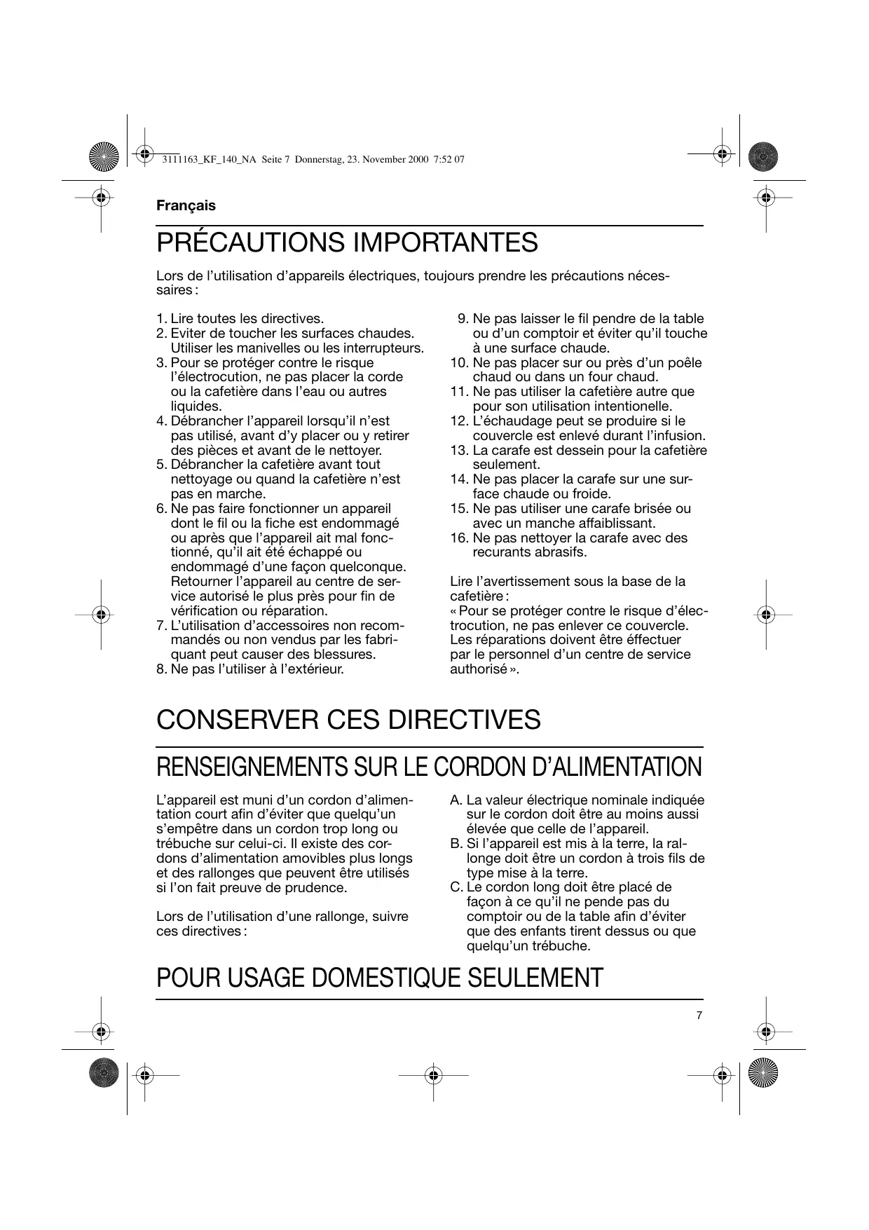É 7 3ini163 KF_140_NA Seite 8 Donnerstag, 23. November 2000 7:52 07 /] Nos produits sont conçus et fabriqués selon les nor- mes les plus rigoureuses de qualité, de conception et de fonctionnalité. Nous espérons que vous profi- terez au maximum des nombreux avantages de votre nouvelle cafetière Braun. Avertissement Lire attentivement toutes les directives avant d'utiliser cet appareil. Tenir cet appareil hors de la portée des enfants! Avant de le brancher, vérifier si la tension inscrite sous l'appareil correspond à celle de la prise de courant (120 V -). Cet appareil est muni d’une fiche d'alimentation polarisée (une des deux broches est plus large que l'autre). Per mesure de sécurité, i n'y a qu’une seule façon d'insérer cette fiche dans une prise de courant polarisée. Si le branchement n’est pas complet, inverser la fiche. Si le branchement est toujours incomplet, communiquer avec un électricien qualifié. Ne pas forcer ce dispositif de sécurité. La plaque chauffante (®) fonctionne lorsque l'appareil est mis sous tension. Éviter de toucher la plaque chauffante et ne jamais laisser le cordon entrer en contact avec celle-ci. Les appareil électriques Braun sont conformes aux normes de sécurité applicables. Toute réparation de ces appareils électriques doit être effectuée par des techniciens autorisés seulement. Les mauvaises réparations et les réparations effectuées par des personnes non qualifiées peuvent causer des dommages ou des blessures graves. Le remplacement du cordon de l'appareil, qui néces- site un outil spécial, peut être effectué seulement à un centre de service après-vente agréé Braun. Important Cet appareil est conçu pour des quantités domesti- ques normales. Toujours utiliser de l’eau froide pour préparer le café. L'eau chaude ou d'autres liquides peuvent endommager la cafetière. Avant d'utiliser la cafetière pour la première fois, ou lorsque celle-ci n'a pas servi pendant un certain temps, remplir le réservoir d’eau froide jusqu’au nombre maximal de tasses, sans mouture de café ni filtre. Mettre l'appareil sous tension et laisser l'eau s'écouler. Jeter ensuite l'eau écoulée et remplir le réservoir d'eau froide fraîche. Une fois que le cycle d'infusion est terminé, mettre l'appareil hors tension et laisser refroidir pendant environ cinq minutes. Sinon, de la vapeur peut se for- mer lorsque l'on verse l'eau froide dans le réservoir et causer des brülures. La cafetière FlavorSelect de Braun est conçue pour une utilisation avec tout fire de format 4. Cepen- dant, seuls les filtres réutilisables de Braun conçus pour la gamme FlavorSelect conviennent parfaite- ment. Avertissement — Le format des filtres réutilisables d'une autre marque peut ne pas convenir à la cafe- tière FlavorSelect de Braun. Nombre maximal de tasses KF 140, KF 145 — 10 tasses (0,125 L /4,4 oz liq. par tasse) KF 152, KF 157 - 12 tasses (0,125 L /4,4 oz liq. par tasse) Description CD Range-cordon @) Indicateur de niveau d'eau ) Réservoir Compensateur d'espace > Cartouche de filtration d'eau {pour les modèles KF 145 et KF 157 uniquement) Cadran pour le remplacement de la cartouche de filtration d'eau Sélecteur de saveur (doux = CP / fort = IP) Couvercle du réservoir à eau D) Porte-fitre >) Panier-filtre Œ@) Plaque chauffante Interrupteur marche-arrêt - KF 140 et KF 152 avec témoin rouge) Interrupteur marche-arrêt - KF 145 et KF 157 {avec témoin rouge) <® Sélecteur du nombre de tasses — KF 145 et KF 157 (avec témoin jaune) Remplissage de café moulu Faire pivoter le panier-filtre () (a) et insérer un filtre n° 4. Mettre la mouture de café (pas trop fine) dans le filtre. Doser la quantité de mouture de café en fonction de l'arôme désiré. Refermer le panier-filtre (a) en s'assurant qu'il est bien enclenché. Filtres permanents Les filtres plaqué or ou à tamis doré peuvent remplacer les filtres papier. Ils comptent parmi les accessoires. À noter: La mouture de café doit être moyenne. Une mouture très fine peut causer le débordement du fitre. Mettre le café moulu au centre du fitre et préparer le café tel qu'il est indiqué. Pour le nettoyage, rincer le filtre à l'eau courante. Après un certain temps d'utilisation, nettoyer le filtre à l'aide d’une brosse ou d'une éponge douce - ne pas employer de nettoyants ni de tampons abrasifs. Les filtres plaqué or et à tamis doré vont au lave- vaisselle. Remplissage d’eau Important: Lors du remplissage d'eau et de la prépa- ration de café, le compensateur d'espace (4) ou la cartouche de filtration d'eau G) doit être installé(e) dans le réservoir à eau (@). Sinon, l'indicateur de niveau d’eau (2) ne fonctionne pas correctement et la verseuse risque de déborder.