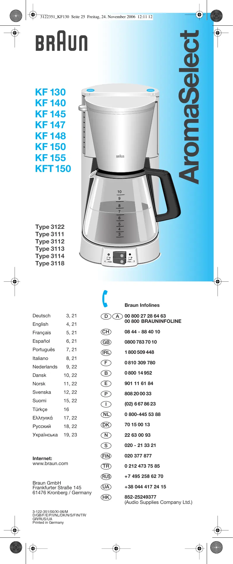 You can use a commercially available decalcifying agent which does not affect aluminium. Follow the instructions of the manufacturer of the decalcifying agent. Repeat the procedure as many times as necessary in order to reduce the brewing time per cup to a normal level. Allow the maximum amount of fresh cold water to run through at least twice to cleanse the coffeemaker. Subject to change without notice. This product conforms to the European Directives EMC 89/336/EEC and Low Voltage 73/23/EEC. Please do not dispose of the product in the household waste at the end of its useful life. Disposal can take place at a Braun Service Centre or at appropriate collection points provided in your country. 3122351_KF130 Seite 5 Freitag, 24. November 2006 12:11 12 Français Précautions Lire attentivement le mode d’emploi avant d’utiliser l’appareil. Cet appareil doit être tenu hors de portée des enfants. Avant de brancher la cafetière, vérifier que la tension du secteur correspond bien à celle indiquée sur le socle de l’appareil. Ne pas toucher les surfaces chaudes de l’appareil en particulier la plaque chauffante. Le cordon ne doit jamais se trouver en contact avec la plaque chauffante. Ne pas poser la verseuse sur d’autres surfaces chauffantes (plaques électriques …). Avant la préparation d’un deuxième café, débrancher l’appareil et attendre que la cafetière refroidisse pendant environ 5 minutes afin d’éviter la production de vapeur lorsque l’eau fraîche est versée dans le réservoir chaud. Les appareils électriques Braun répondent aux normes de sécurité en vigueur. Leur réparation ou le changement du cordon d’alimentation doivent être effectués uniquement par les Centres Service Agréés Braun (C.S.A. – voir liste sur le 3615 Braun). Des réparations effectuées par du personnel non qualifié peuvent causer accidents ou blessures à l’utilisateur. Cette cafetière électrique est conçue pour un usage domestique uniquement. Utiliser toujours de l’eau froide pour préparer le café. Contenance maximum: KF 130 – KF 148 10 tasses (125 ml chacune) 15 tasses (83 ml chacune) KF 150, KF 155 12 tasses (125 ml chacune) 18 tasses (83 ml chacune) Description ! Cordon/rangement du cordon " Compensateur d’espace # Indicateur de niveau d’eau $ Réservoir d’eau % Cartouche filtrante (n’est pas livré avec modèle KF 130 / KF 148) & Sélecteur d’arôme = goût plus doux = goût plus corsé ' Indicateur de remplacement de la cartouche filtrante ( Porte-filtre avec stop gouttes ) Plaque chauffante