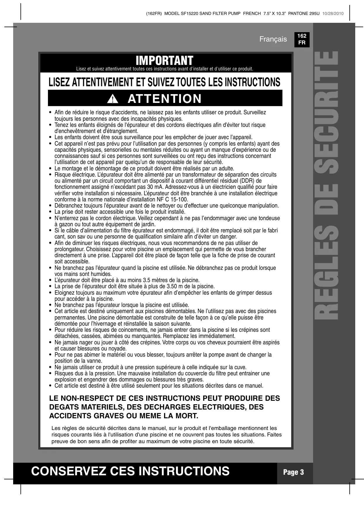 ACCIDENTS GRAVES OU MEME LA MORT. Les règles de sécurité décrites dans le manuel, sur le produit et l'emballage mentionnent les risques courants liés à l'utilisation d'une piscine et ne couvrent pas toutes les situations. Faites preuve de bon sens afin de profiter au maximum de votre piscine en toute sécurité.