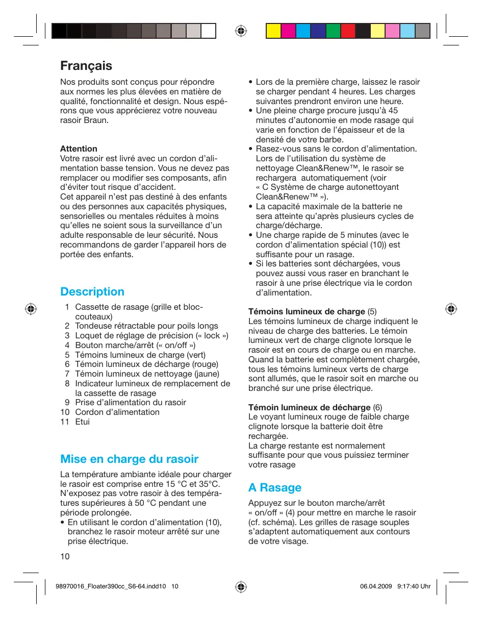 Français Nos produits sont conçus pour répondre aux normes les plus élevées en matière de qualité, fonctionnalité et design. Nous espé- rons que vous apprécierez votre nouveau rasoir Braun. Attention Votre rasoir est livré avec un cordon d'ali- mentation basse tension. Vous ne devez pas remplacer ou modifier ses composants, afin d'éviter tout risque d'accident. Cet appareil n'est pas destiné à des enfants où des personnes aux capacités physiques, sensorielles ou mentales réduites à moins qu'elles ne soient sous la surveillance d'un adulte responsable de leur sécurité. Nous recommandons de garder l'appareil hors de portée des enfants. Description Cassette de rasage (grille et bloc- couteaux) Tondeuse rétractable pour poils longs Loquet de réglage de précision (« lock ») Bouton marche/arrêt (« on/off ») Témoins lumineux de charge (vert) Témoin lumineux de décharge (rouge) Témoin lumineux de nettoyage (jaune) Indicateur lumineux de remplacement de la cassette de rasage Prise d'alimentation du rasoir 10 Cordon d'alimentation 11 Etui HNOMBEWN