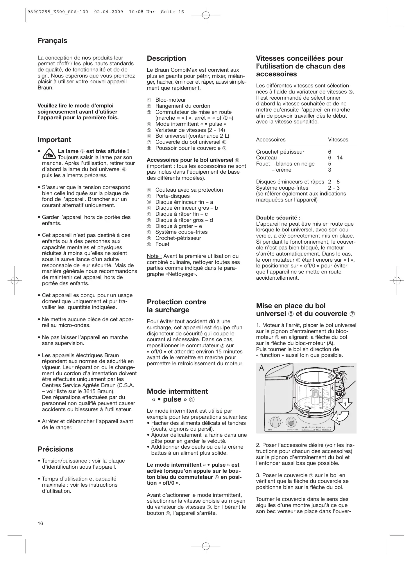 Description Le Braun CombiMax est convient aux plus exigeants pour pétrir, mixer, mélanger, hacher, émincer et râper, aussi simplement que rapidement. 1 Bloc-moteur 2 Rangement du cordon 3 Commutateur de mise en route (marche = « I », arrêt = « off/0 ») 4 Mode intermittent « • pulse » 5 Variateur de vitesses (2 - 14) 6 Bol universel (contenance 2 L) 7 Couvercle du bol universel 6 8 Poussoir pour le couvercle 7 Accessoires pour le bol universel 6 (Important : tous les accessoires ne sont pas inclus dans l’équipement de base des différents modèles).