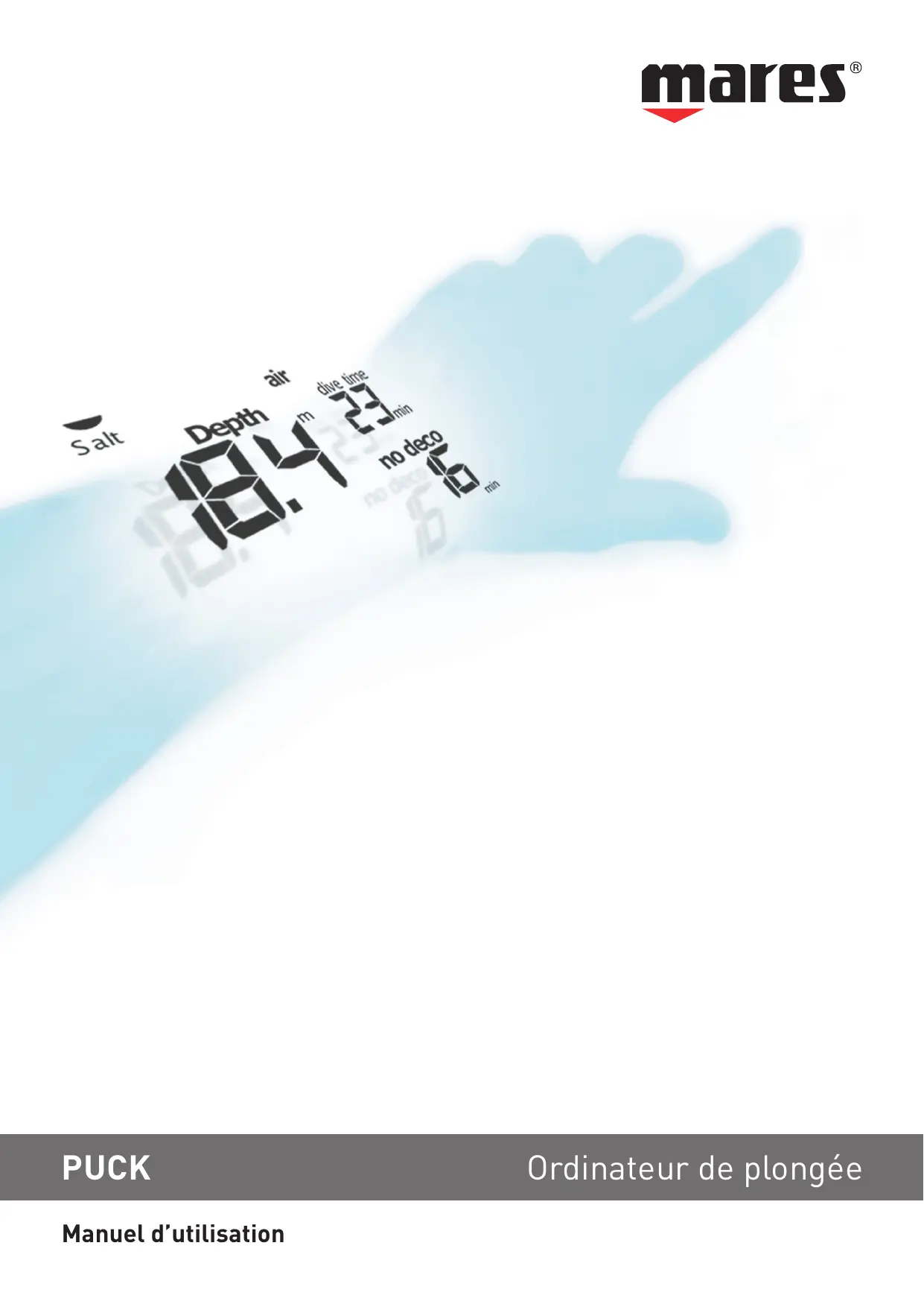 - ORDINATEUR DE PLONGÉE PUCK ATTENTION ATTENTION Félicitations ! Votre nouvel ordinateur de plongée PUCK est le fruit des plus récentes recherches Mares, il a été conçu pour garantir le maximum de sécurité, d’efficacité, de fiabilité et de longévité. Simple et facile d’utilisation, c’est l’idéal pour tous les types de plongée. Ce manuel contient toutes les instructions nécessaires à son utilisation. Mares vous remercie de votre choix et vous recommande de toujours plonger avec le sens des responsabilités et la plus extrême prudence. Bonne plongée ! Aucune partie de ce document ne peut être reproduite, conservée dans un système d’extraction ou transmise sous quelque forme que ce soit sans une autorisation écrite de Mares S.p.A. Mares a une politique d’amélioration continue, et par conséquent se réserve le droit d’apporter des modifications et des améliorations à tous les produits décrits dans ce manuel sans avertissement préalable. En aucun cas Mares ne pourra être tenu responsable de toute perte ou tout dommage subi par des tierces parties du fait de l’utilisation de cet instrument. Ne plongez jamais seul(e), PUCK ne remplace pas un coéquipier. L’ordinateur ne doit jamais être utilisé dans des conditions qui entravent son utilisation (par exemple : visibilité faible ou inexistante rendant impossible la lecture du cadran) et dans lesquelles il est nécessaire d’utiliser des systèmes de sécurité appropriés. AVERTISSEMENTS IMPORTANTS Ne prenez pas l’avion dans les 24 heures suivant votre dernière plongée, et dans tous les cas attendez que le signal « No fly » du PUCK disparaisse. Important : Toute information ou tout avertissement critique qui peut affecter les performances ou provoquer la blessure d’un technicien, du propriétaire de l’ordinateur Puck ou de toute autre personne, est mise en évidence par les symboles suivants : attention Indique une situation potentiellement dangereuse qui, si elle n’est pas évitée, peut aboutir à des blessures mineures ou modérées. Peut aussi être utilisé pour alerter en cas de pratiques dangereuses. ATTENTION Indique une situation potentiellement dangereuse qui, si elle n’est pas évitée, peut aboutir à la mort ou à des blessures sérieuses. DANGER Indique une situation dangereuse imminente qui, si elle n’est pas évitée, pourrait aboutir à la mort ou à des blessures sérieuses. Avant de plonger, assurez-vous d’avoir lu et compris toutes les sections de ce manuel d’utilisation. ATTENTION L’ordinateur de plongée PUCK est conçu exclusivement pour la plongée loisirs. Il ne doit pas être utilisé pour la plongée professionnelle. ATTENTION En plus de l’ordinateur de plongée, l’utilisateur doit avoir à sa disposition un profondimètre, un manomètre immergeable, une montre ou un chronomètre et une table de plongée. ATTENTION Ne plongez pas si les données affichées à l’écran de l’instrument paraissent irrégulières ou peu claires. ATTENTION L’ordinateur de plongée ne peut pas garantir contre un possible accident de décompression. L’ordinateur de plongée ne peut prendre en compte la condition physique d’un plongeur particulier, celle-ci pouvant varier d’un jour à l’autre. Pour votre sécurité, effectuez une visite médicale de contrôle avant la plongée. ATTENTION Vérifiez toujours le niveau de la pile avant de plonger. Ne plongez pas si l’icône indique que la pile est trop faible. Remplacez la pile. ATTENTION ATTENTION Les plongeurs loisirs ne devraient pas dépasser la profondeur de 40 mètres (130 pieds). Cependant cet ordinateur continue de fournir des informations pour la plongée à l’air après 40 mètres (130 pieds), limite au-delà de laquelle les risques de narcose à l’azote et d’accident de décompression (DCS) s’accroissent considérablement. Par conséquent, ces informations ne doivent être utilisées qu’à titre indicatif. ATTENTION Ne plongez jamais au-delà de 40 mètres (130 pieds), et ne faites jamais de plongées nécessitant des paliers avec PUCK sauf si vous possédez le brevet spécifique (IANTD, NAUI, PADIDSAT, PSA, SSI, TDI, etc.) pour la plongée à des profondeurs supérieures à 40 mètres (130 pieds) et que vous comprenez parfaitement les risques et les compétences que ce type de plongée nécessite. Ce type de plongée comporte un risque plus grand d’accident de décompression, même pour les plongeurs les plus experts et qualifiés, quel que soit le type d’instruments ou d’ordinateur utilisé. Les plongeurs tentant ce type de plongée doivent avoir suivi une formation spécialisée et acquis l’expérience nécessaire. La sécurité d’une plongée ne peut être améliorée que par une préparation et un entraînement adaptés. Mares conseille par conséquent de n’utiliser l’ordinateur de plongée qu’après avoir achevé une formation de plongée spécialisée. Mares conseille de respecter scrupuleusement les règles de comportement simples indiquées ci-dessous : COMPORTEMENT RESPONSABLE
