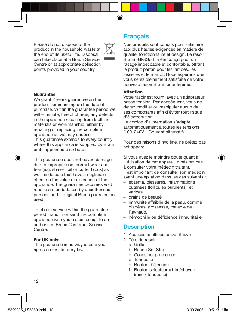 Français Please do not dispose of the product in the household waste at the end of its useful life. Disposal can take place at a Braun Service Centre or at appropriate collection points provided in your country. Guarantee We grant 2 years guarantee on the product commencing on the date of purchase. Within the guarantee period we will eliminate, free of charge, any defects in the appliance resulting from faults in materials or workmanship, either by repairing or replacing the complete appliance as we may choose. This guarantee extends to every country where this appliance is supplied by Braun or its appointed distributor. This guarantee does not cover: damage due to improper use, normal wear and tear (e.g. shaver foil or cutter block) as well as defects that have a negligible effect on the value or operation of the appliance. The guarantee becomes void if repairs are undertaken by unauthorised persons and if original Braun parts are not used. To obtain service within the guarantee period, hand in or send the complete appliance with your sales receipt to an authorised Braun Customer Service Centre. For UK only: This guarantee in no way affects your rights under statutory law. Nos produits sont conçus pour satisfaire aux plus hautes exigences en matière de qualité, fonctionnalité et design. Le rasoir Braun Silk&Soft, a été conçu pour un rasage impeccable et confortable, offrant le produit parfait pour les jambes, les aisselles et le maillot. Nous espérons que vous serez pleinement satisfaite de votre nouveau rasoir Braun pour femme. Attention Votre rasoir est fourni avec un adaptateur basse tension. Par conséquent, vous ne devez modifier ou manipuler aucun de ses composants afin d’éviter tout risque d’électrocution. Le cordon d’alimentation s’adapte automatiquement à toutes les tensions (100–240V – Courant alternatif). Pour des raisons d’hygiène, ne prêtez pas cet appareil. Si vous avez le moindre doute quant à l’utilisation de cet appareil, n’hésitez pas à consulter votre médecin traitant. Il est important de consulter son médecin avant une épilation dans les cas suivants : – eczéma, blessures, inflammations cutanées (follicules purulents) et varices, – grains de beauté, – immunité affaiblie de la peau, comme diabètes, grossesse, maladie de Raynaud, – hémophilie ou déficience immunitaire. Description 1 Accessoire efficacité OptiShave 2 Tête du rasoir a Grille b Bande SoftStrip c Coussinet protecteur d Tondeuse e Bouton d’éjection f Bouton sélecteur « trim/shave » (rasoir-tondeuse)