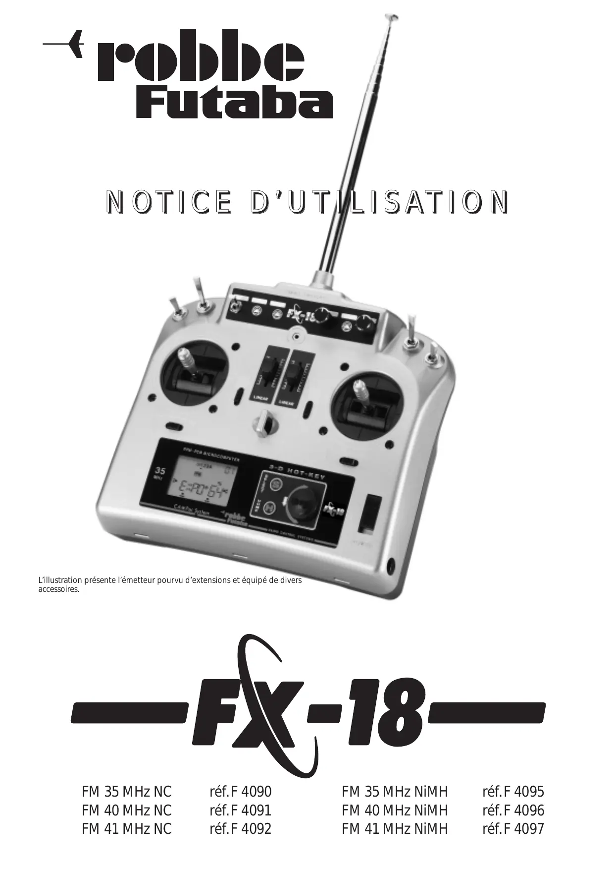 - N O T I C E D ’ U T I L I S AT I O N L’illustration présente l’émetteur pourvu d’extensions et équipé de divers accessoires. FM 35 MHz NC FM 40 MHz NC FM 41 MHz NC réf. F 4090 réf. F 4091 réf. F 4092 FM 35 MHz NiMH FM 40 MHz NiMH FM 41 MHz NiMH réf. F 4095 réf. F 4096 réf. F 4097 réf. F4090 - F4091 - F4092 F4095 - F4096 - F4097 Sommaire Chapitre