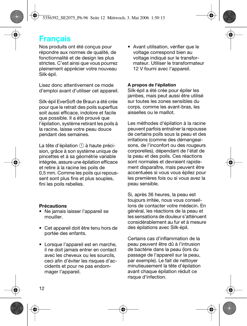 5356392_SE2075_P6-96 Seite 12 Mittwoch, 3. Mai 2006 1:50 13 Français Nos produits ont été conçus pour répondre aux normes de qualité, de fonctionnalité et de design les plus strictes. C’est ainsi que vous pourrez pleinement apprécier votre nouveau Silk·épil.