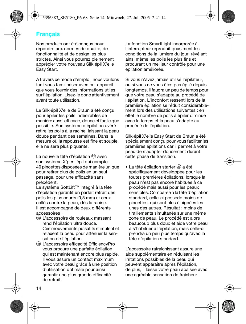 Français Nos produits ont été conçus pour répondre aux normes de qualité, de fonctionnalité et de design les plus strictes. Ainsi vous pourrez pleinement apprécier votre nouveau Silk·épil X’elle Easy Start. La fonction SmartLight incorporée à l’interrupteur reproduit quasiment les conditions de la lumière du jour, révélant ainsi même les poils les plus fins et procurant un meilleur contrôle pour une épilation améliorée. A travers ce mode d’emploi, nous voulons tant vous familiariser avec cet appareil que vous fournir des informations utiles sur l’épilation. Lisez-le donc attentivement avant toute utilisation. Si vous n’avez jamais utilisé l’épilateur, ou si vous ne vous êtes pas épilé depuis longtemps, il faudra un peu de temps pour que votre peau s’adapte au procédé de l’épilation. L’inconfort ressenti lors de la première épilation se réduit considérablement lors des utilisations suivantes : en effet le nombre de poils à épiler diminue avec le temps et la peau s’adapte au procédé de l’épilation. Le Silk·épil X’elle de Braun a été conçu pour épiler les poils indésirables de manière aussi efficace, douce et facile que possible. Son système d’épilation avéré retire les poils à la racine, laissant la peau douce pendant des semaines. Dans la mesure où la repousse est fine et souple, elle ne sera plus piquante. La nouvelle tête d’épilation B avec son système X’pert-épil qui compte 40 pincettes disposées de manière unique pour retirer plus de poils en un seul passage, pour une efficacité sans précédent. Le système SoftLift™ intégré à la tête d’épilation garantit un parfait retrait des poils les plus courts (0,5 mm) et ceux collés contre la peau, dès la racine. Il est accompagné de deux différents accessoires : A L’accessoire de rouleaux massant rend l’épilation ultra douce. Ces mouvements pulsatifs stimulent et relaxent la peau pour atténuer la sensation de l’épilation. a L’accessoire efficacité EfficiencyPro vous procure une parfaite épilation qui est maintenant encore plus rapide. Il vous assure un contact maximum avec votre peau grâce à une position d’utilisation optimale pour ainsi garantir une plus grande efficacité de retrait.