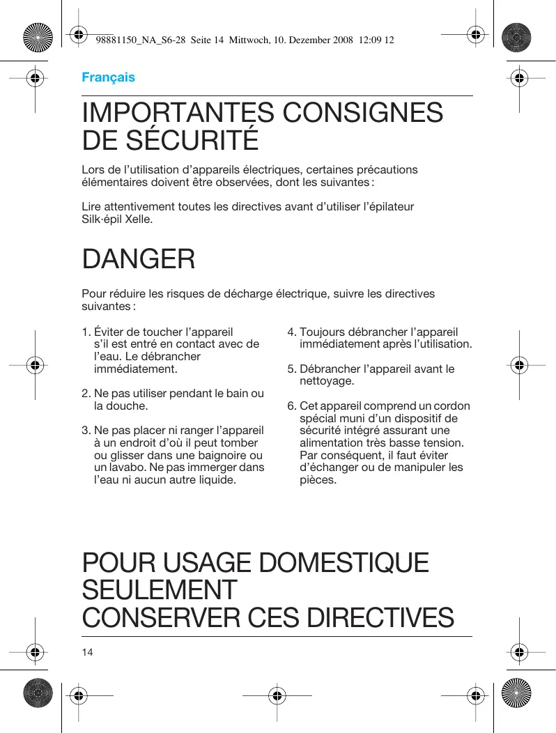 Lors de l’utilisation d'appareils électriques, certaines précautions élémentaires doivent être observées, dont les suivantes : Lire attentivement toutes les directives avant d'utiliser l’épilateur Silk-épil Xelle. DANGER Pour réduire les risques de décharge électrique, suivre les directives suivantes : . Éviter de toucher l'appareil s'il est entré en contact avec de l'eau. Le débrancher immédiatement.
