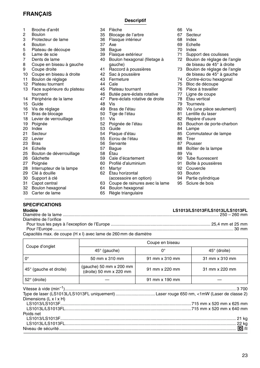 SPECIFICATIONS Modèle LS1013/LS1013F/LS1013L/LS1013FL Diamètre de la lame …… 250 — 260 mm Diamètre de l'orifice Pour tous les pays à l'exception de l'Europe . Pour l'Europe … Capacités max. de coupe (H xl) avec lame de 260 mm de diamètre