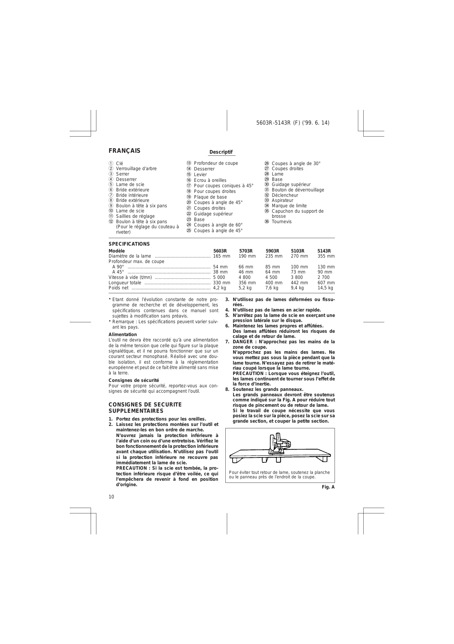 Les retours de lame se produisent lorsque la scie cale brusquement et qu’elle recule vers l’opérateur. Si la lame se grippe ou qu’elle cale, relâchez immédiatement le déclencheur. Maintenez les lames bien affûtées. Soutenez les grands panneaux comme indiqué à la Fig. A. Pour effectuer une refente, utilisez une barrière ou un guidage de bord droit. Ne forcez pas l’outil. Restez en alerte de façon à bien garder le contrôle de l’outil. Ne retirez pas la scie de la pièce pendant la coupe, alors que la lame est en train de tourner. Ne mettez JAMAIS la main ou les doigts derrière la scie. En cas de retour de lame, la scie pourrait facilement faire un bond en arrière sur votre main, et vous pourriez gravement vous blesser.
