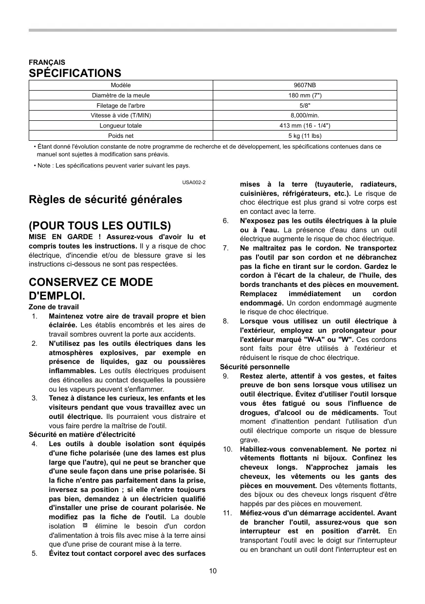 - Note : Les spécifications peuvent varier suivant les pays. USA002-2 mises à la terre (tuyauterie, radiateurs, cuisinières, réfrigérateurs, etc.). Le risque de choc électrique est plus grand si votre corps est en contact avec la terre. N'exposez pas les outils électriques à la pluie ou à l'eau. La présence d'eau dans un outil électrique augmente le risque de choc électrique. Ne maltraitez pas le cordon. Ne transportez pas l'outil par son cordon et ne débranchez pas la fiche en tirant sur le cordon. Gardez le cordon à l'écart de la chaleur, de l'huile, des bords tranchants et des pièces en mouvement. Remplacez immédiatement cordon endommagé. Un cordon endommagé augmente le risque de choc électrique. Lorsque vous utilisez un outil électrique à l'extérieur, employez un prolongateur pour l'extérieur marqué "W-A" ou "W". Ces cordons sont faits pour être utilisés à l'extérieur et réduisent le risque de choc électrique. Sécurité personnelle Restez alerte, attentif à vos gestes, et faites preuve de bon sens lorsque vous utilisez un outil électrique. Évitez d'utiliser l'outil lorsque vous êtes fatigué ou sous l'influence de drogues, d'alcool ou de médicaments. Tout moment d'inattention pendant l'utilisation d'un outil électrique comporte un risque de blessure grave.