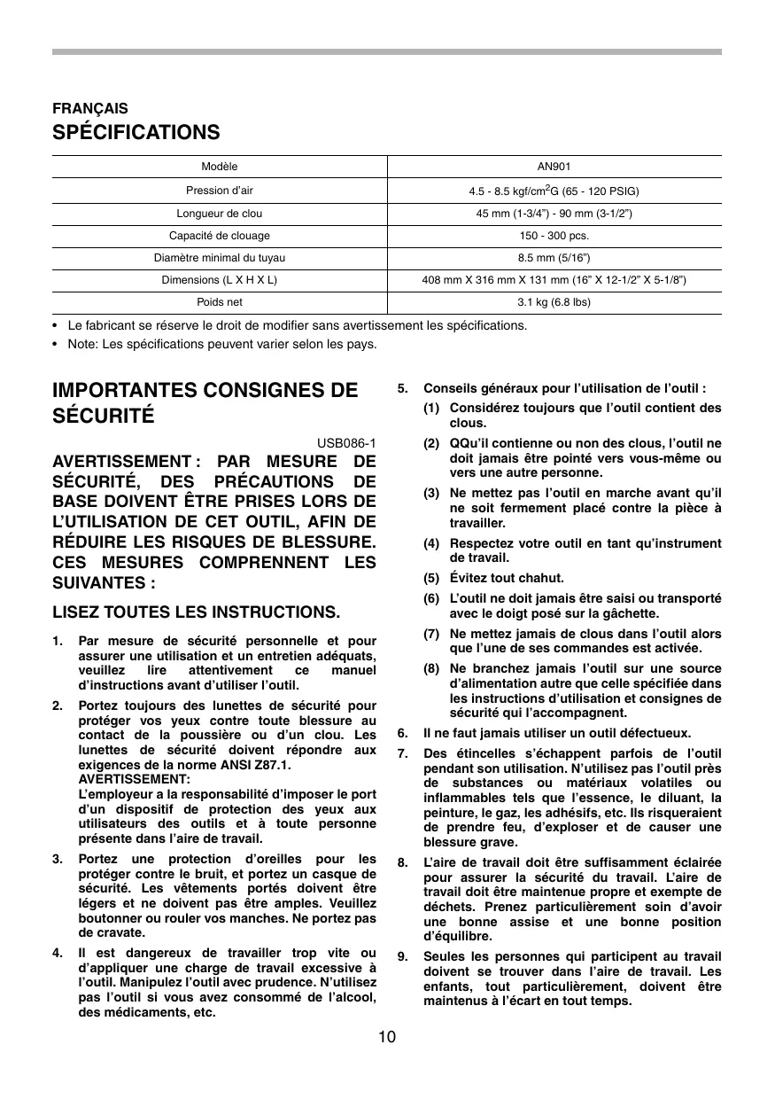- Note: Les spécifications peuvent varier selon les pays. (1) Considérez toujours que l’outil contient des clous. USB086-1 (2) QQu’il contienne ou non des clous, l’outil ne doit jamais être pointé vers vous-même ou vers une autre personne. (3) Ne mettez pas l’outil en marche avant qu’il ne soit fermement placé contre la pièce à travailler. (4) Respectez votre outil en tant qu’instrument de travail. (5) Évitez tout chahut. (6) L’outil ne doit jamais être saisi ou transporté avec le doigt posé sur la gâchette. Conseils généraux pour l’utilisation de l’outil : (7) Ne mettez jamais de clous dans l’outil alors que l’une de ses commandes est activée. Par mesure de sécurité personnelle et pour assurer une utilisation et un entretien adéquats, veuillez lire attentivement manuel d’instructions avant d’utiliser l’outil. (8) Ne branchez jamais l’outil sur une source d’alimentation autre que celle spécifiée dans les instructions d’utilisation et consignes de sécurité qui l’accompagnent. Portez toujours des lunettes de sécurité pour protéger vos yeux contre toute blessure au contact de la poussière ou d’un clou. Les lunettes de sécurité doivent répondre aux exigences de la norme ANSI Z87.1.