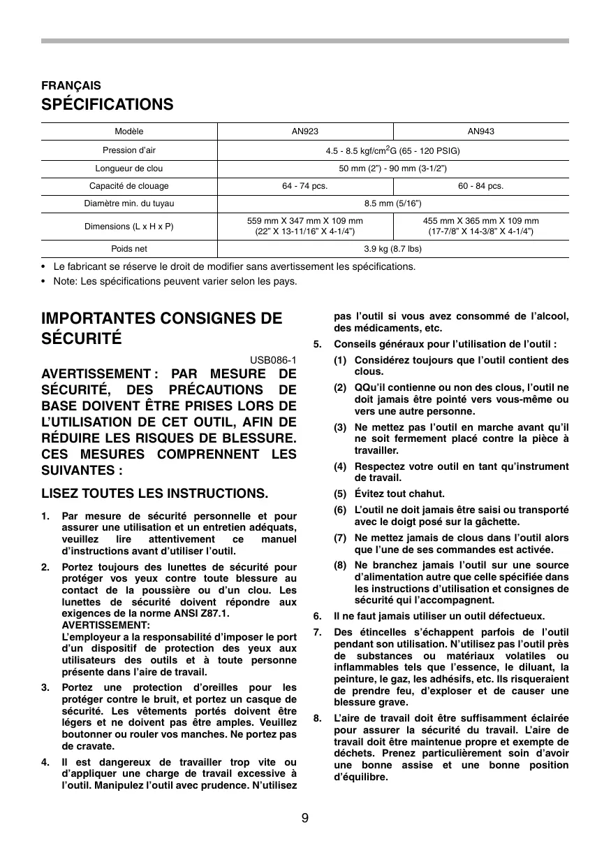 Par mesure de sécurité personnelle et pour assurer une utilisation et un entretien adéquats, veuillez lire attentivement manuel d’instructions avant d’utiliser l’outil. (7) Ne mettez jamais de clous dans l’outil alors que l’une de ses commandes est activée. (8) Ne branchez jamais l’outil sur une source d’alimentation autre que celle spécifiée dans les instructions d’utilisation et consignes de sécurité qui l’accompagnent. Portez toujours des lunettes de sécurité pour protéger vos yeux contre toute blessure au contact de la poussière ou d’un clou. Les lunettes de sécurité doivent répondre aux exigences de la norme ANSI Z87.1.