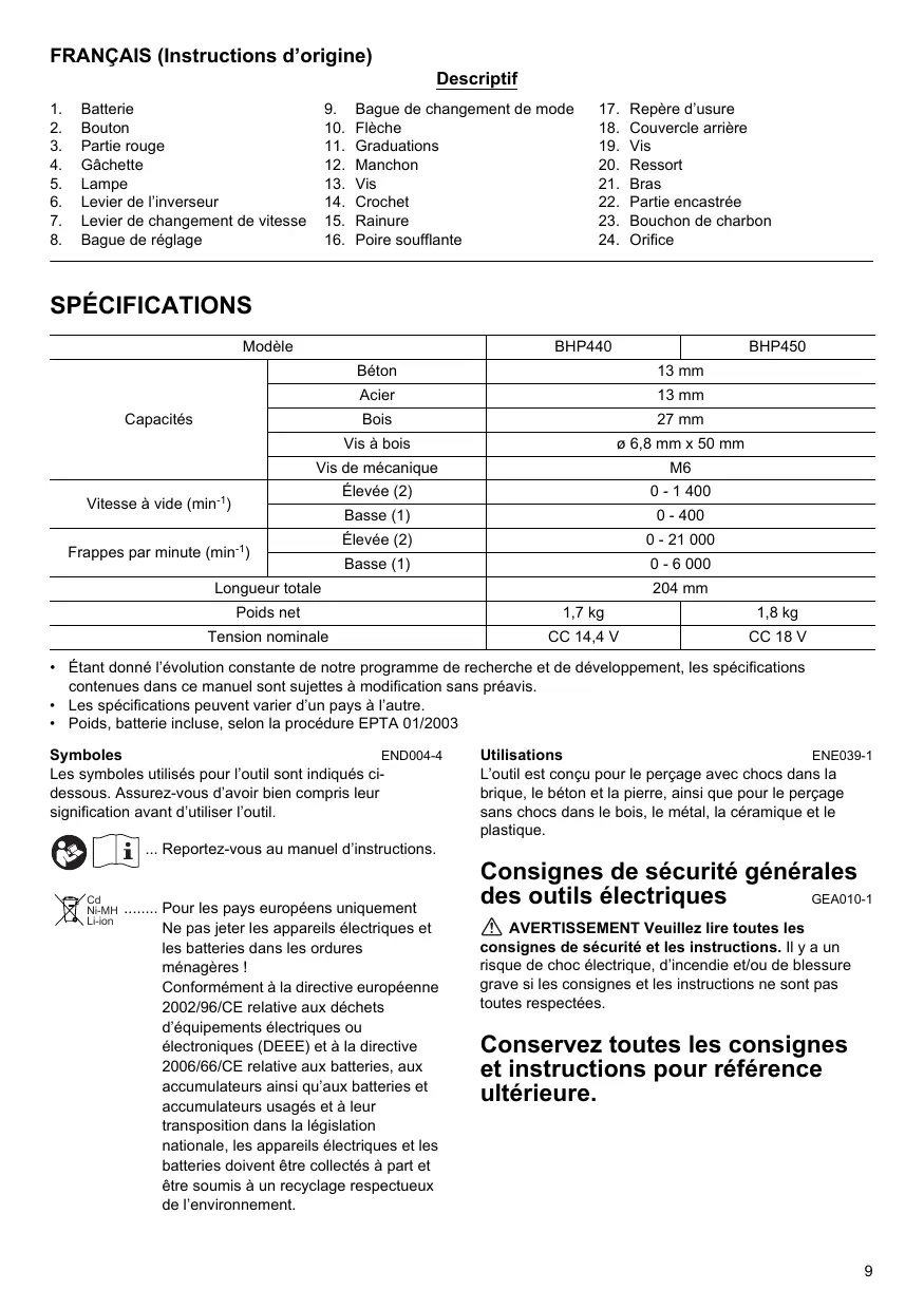 SPÉCIFICATIONS Modèle BHP440 BHP450 Béton 13 mm Acier 13 mm Capacités Bois 27 mm Vis à bois 9 6,8 mm x 50 mm Vis de mécanique M6 Élevée (2) 0-1400 Vitesse à vide (min-') Basse (1) 0-400 Élevée (2) 0-21 000 Frappes par minute (min!) Basse (1) 0-6000 Longueur totale 204 mm Poids net TTKkg 18kg Tension nominale CC144V cc18V + Étant donné l'évolution constante de notre programme de recherche et de développement, les spécifications contenues dans ce manuel sont sujettes à modification sans préavis. +_Les spécifications peuvent varier d'un pays à l'autre. + Poids, batterie incluse, selon la procédure EPTA 01/2003 Symboles ENDO044 Utilisations ENE039-1 Les symboles utilisés pour l'outil sont indiqués ci- dessous. Assurez-vous d'avoir bien compris leur signification avant d'utiliser l'outil @ CE Reportez-vous au manuel d'instructions.