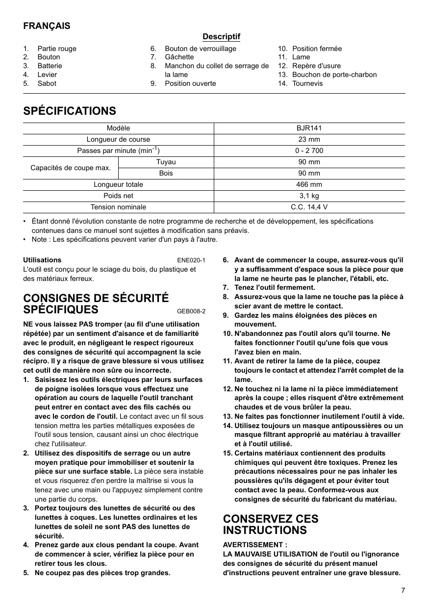 FRANÇAIS Descriptif 1. Partie rouge 6. Bouton de verrouillage 10. Position fermée 2. Bouton 7. Gâchete 11. Lame 3. Batterie 8. Manchon du collet de serrage de 12. Repère d'usure 4. Levier la lame 13. Bouchon de porte-charbon 5. Sabot 9. Position ouverte 14. Tournevis SPÉCIFICATIONS Modèle BJR141 Longueur de course 23 mm Passes par minute (min°1) 0-2700 Tuyau 90 mm Capacités de coupe max. Bois 90 mm Longueur totale 466 mm Poids net 3,7kg Tension nominale CC.144V