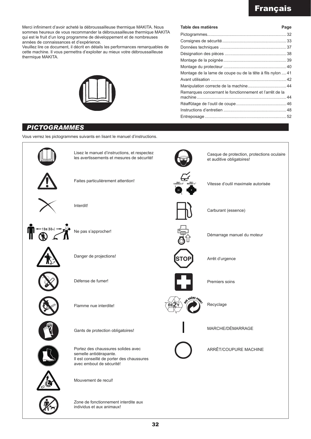 - Français Merci infiniment d’avoir acheté la débroussailleuse thermique MAKITA. Nous sommes heureux de vous recommander la débroussailleuse thermique MAKITA qui est le fruit d’un long programme de développement et de nombreuses années de connaissances et d’expérience. Veuillez lire ce document, il décrit en détails les performances remarquables de cette machine. Il vous permettra d’exploiter au mieux votre débroussailleuse thermique MAKITA. Table des matières Page Pictogrammes p. 32