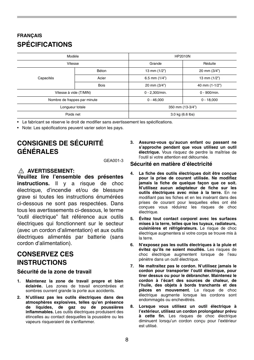 FRANÇAIS SPÉCIFICATIONS Modèle HP2010N Vitesse Grande Réduite Béton 13 mm (1/2”) 20 mm (3/4”) Acier