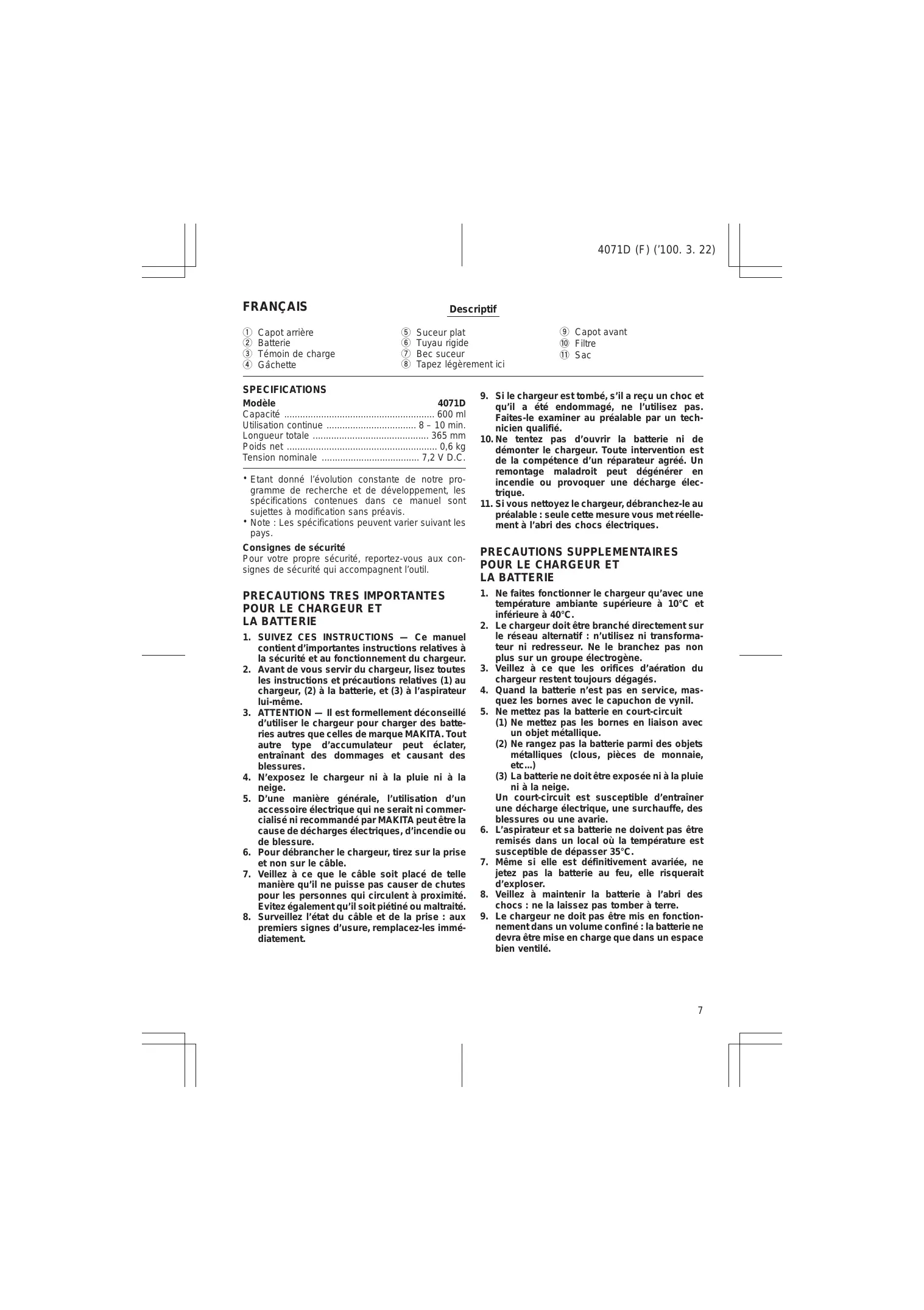 4071D Capacité 600 ml Utilisation continue 8 – 10 min. Longueur totale 365 mm Poids net 0,6 kg Tension nominale 7,2 V D.C. • Etant donné l’évolution constante de notre programme de recherche et de développement, les spécifications contenues dans ce manuel sont sujettes à modification sans préavis. • Note : Les spécifications peuvent varier suivant les pays.