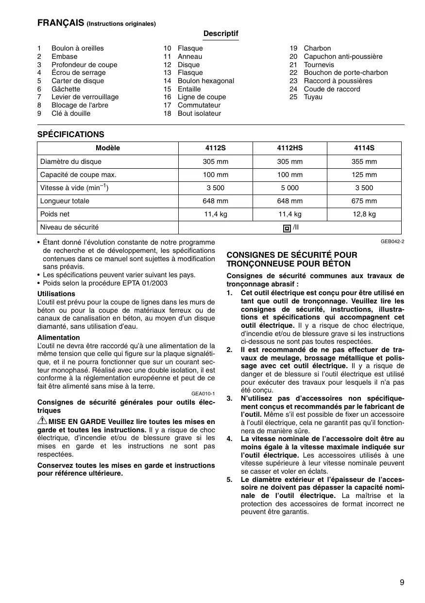 • Les spécifications peuvent varier suivant les pays. • Poids selon la procédure EPTA 01/2003 Utilisations L’outil est prévu pour la coupe de lignes dans les murs de béton ou pour la coupe de matériaux ferreux ou de canaux de canalisation en béton, au moyen d’un disque diamanté, sans utilisation d’eau. Alimentation L’outil ne devra être raccordé qu’à une alimentation de la même tension que celle qui figure sur la plaque signalétique, et il ne pourra fonctionner que sur un courant secteur monophasé. Réalisé avec une double isolation, il est conforme à la réglementation européenne et peut de ce fait être alimenté sans mise à la terre. GEA010-1