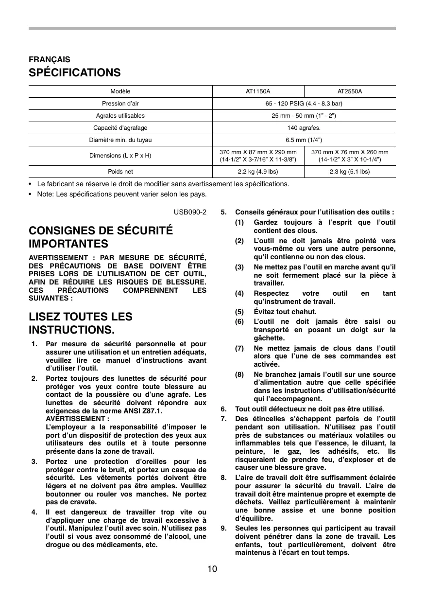 - Par mesure de sécurité personnelle et pour assurer une utilisation et un entretien adequats, veuillez dire ce manuel d'instructions avant d'utiliser l'outil.