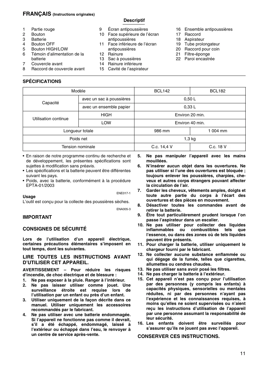 Ensemble antipoussières Raccord Aspirateur Tube prolongateur Raccord pour coin Filtre-éponge Paroi encastrée SPÉCIFICATIONS Modèle BCL142 avec un sac à poussières BCL182 0,50 L Capacité avec un ensemble papier 0,33 L HIGH Environ 20 min. Utilisation continue LOW Environ 40 min. Longueur totale 986 mm Poids net 1 004 mm 1,3 kg Tension nominale C.c. 14,4 V