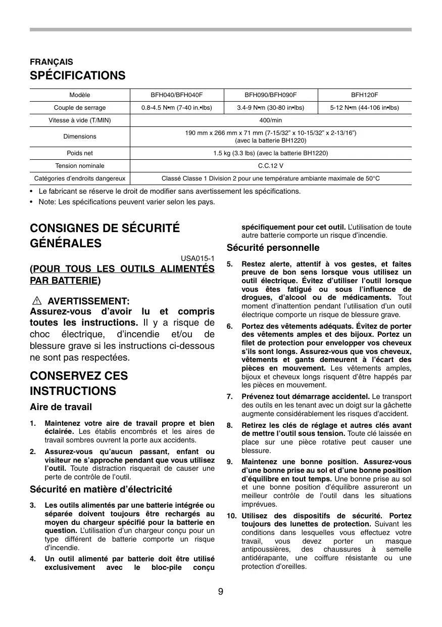 SPÉCIFIQUES USB081-3 NE vous laissez PAS tromper (au fil d’une utilisation répétée) par un sentiment d’aisance et de familiarité avec le produit, en négligeant le respect rigoureux des consignes de sécurité qui accompagnent le tournevis sans fil. Si vous n’utilisez pas cet outil de façon sûre et adéquate, vous courez un risque de blessure grave.
