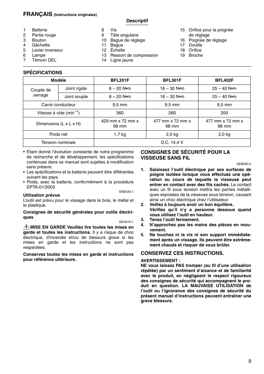 Vis Tête angulaire Bague de réglage Bague Échelle Ressort de compression Ligne jaune 15 Orifice pour la poignée de réglage 16 Poignée de réglage 17 Douille 18 Orifice 19 Broche SPÉCIFICATIONS Modèle Couple de serrage BFL201F BFL301F BFL402F Joint rigide 8 – 20 N•m 16 – 30 N•m 25 – 40 N•m Joint souple 8 – 20 N•m 16 – 30 N•m 25 – 40 N•m Carré conducteur 9,5 mm 9,5 mm 9,5 mm Vitesse à vide (min–1)