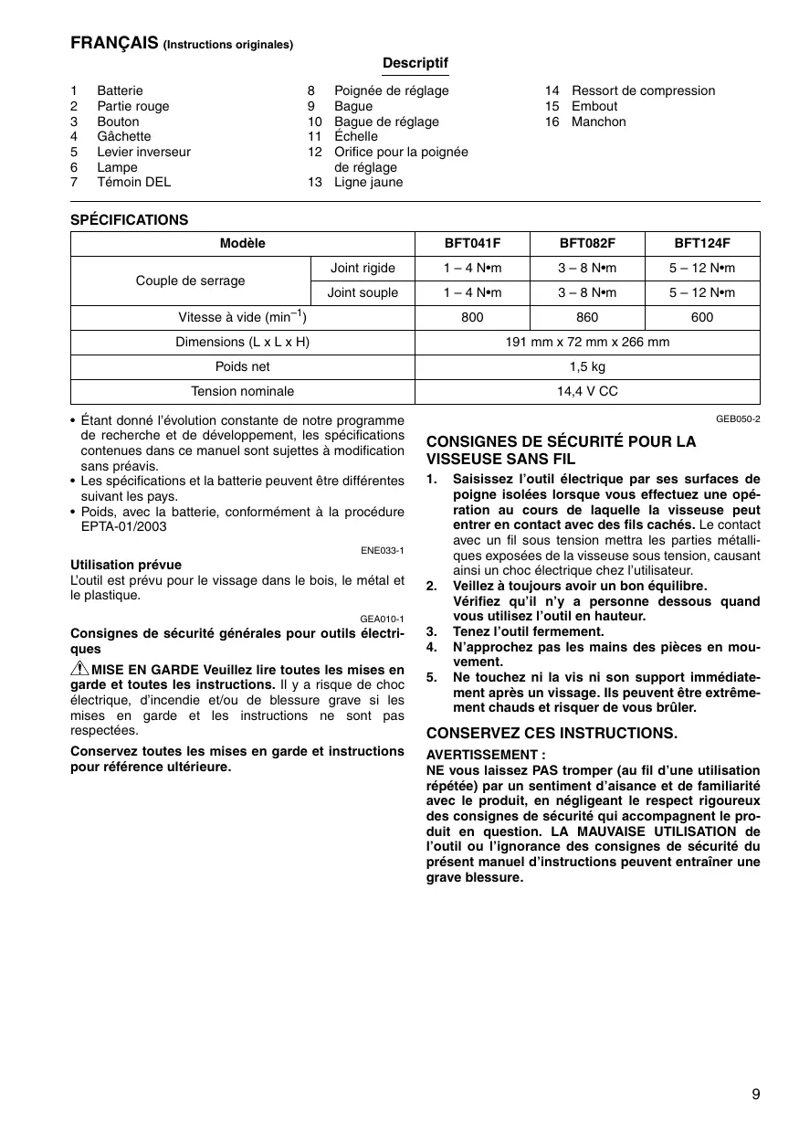 Poignée de réglage Bague Bague de réglage Échelle Orifice pour la poignée de réglage 13 Ligne jaune 14 Ressort de compression 15 Embout 16 Manchon SPÉCIFICATIONS Modèle BFT041F BFT082F BFT124F Joint rigide 1 – 4 N•m 3 – 8 N•m 5 – 12 N•m Joint souple 1 – 4 N•m 3 – 8 N•m 5 – 12 N•m