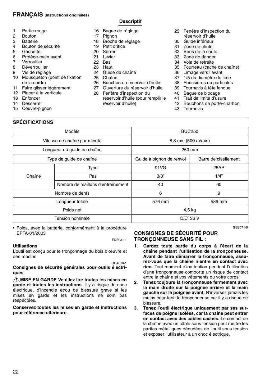Bague de réglage Pignon Broche de réglage Petit orifice Serrer Levier Bas Haut Guide de chaîne Chaîne Bouchon du réservoir d’huile Ouverture du réservoir d’huile Fenêtre d’inspection du réservoir d’huile (pour remplir le réservoir d’huile) 29 Fenêtre d’inspection du réservoir d’huile 30 Guide inférieur 31 Zone de chute 32 Sens de la chute 33 Zone de danger 34 Voie de retraite 35 Fourreau (cache de chaîne) 36 Limage vers l’avant 37 1/5 du diamètre de lime 38 Poussières ou particules 39 Tournevis à tête fendue 40 Bague de blocage 41 Trait de limite d’usure 42 Bouchons de porte-charbon 43 Tournevis SPÉCIFICATIONS Modèle BUC250 Vitesse de chaîne par minute 8,3 m/s (500 m/min) Longueur du guide de chaîne 250 mm Type de guide de chaîne Guide à pignon de renvoi Barre de cisellement Type 91VG 25AP Pas 3/8” 1/4” Nombre de maillons d’entraînement