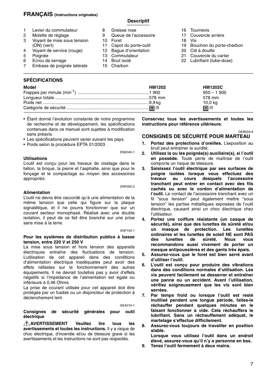 HM1202 Frappes par minute (min-1) 1 900 Longueur totale 578 mm Poids net 9,9 kg Catégorie de sécurité /II • Étant donné l’évolution constante de notre programme de recherche et de développement, les spécifications contenues dans ce manuel sont sujettes à modification sans préavis. • Les spécifications peuvent varier suivant les pays. • Poids selon la procédure EPTA 01/2003