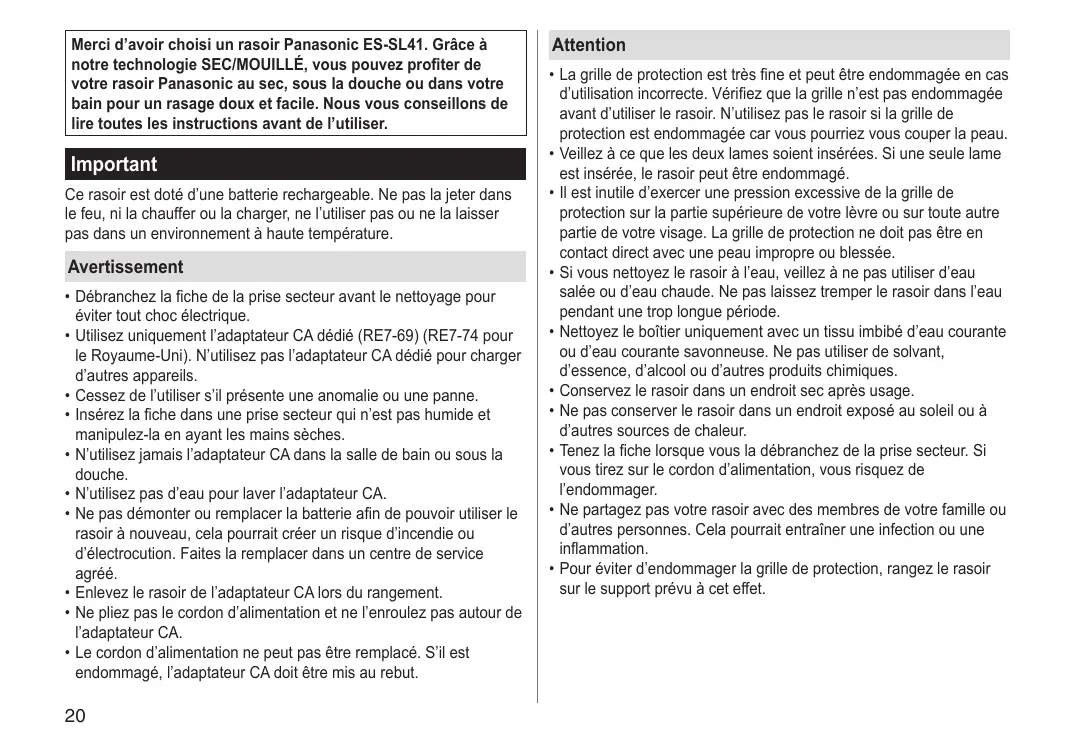Merci d’avoir choisi un rasoir Panasonic ES‑SL41. Grâce à notre technologie SEC/MOUILLÉ, vous pouvez profiter de votre rasoir Panasonic au sec, sous la douche ou dans votre bain pour un rasage doux et facile. Nous vous conseillons de lire toutes les instructions avant de l’utiliser.