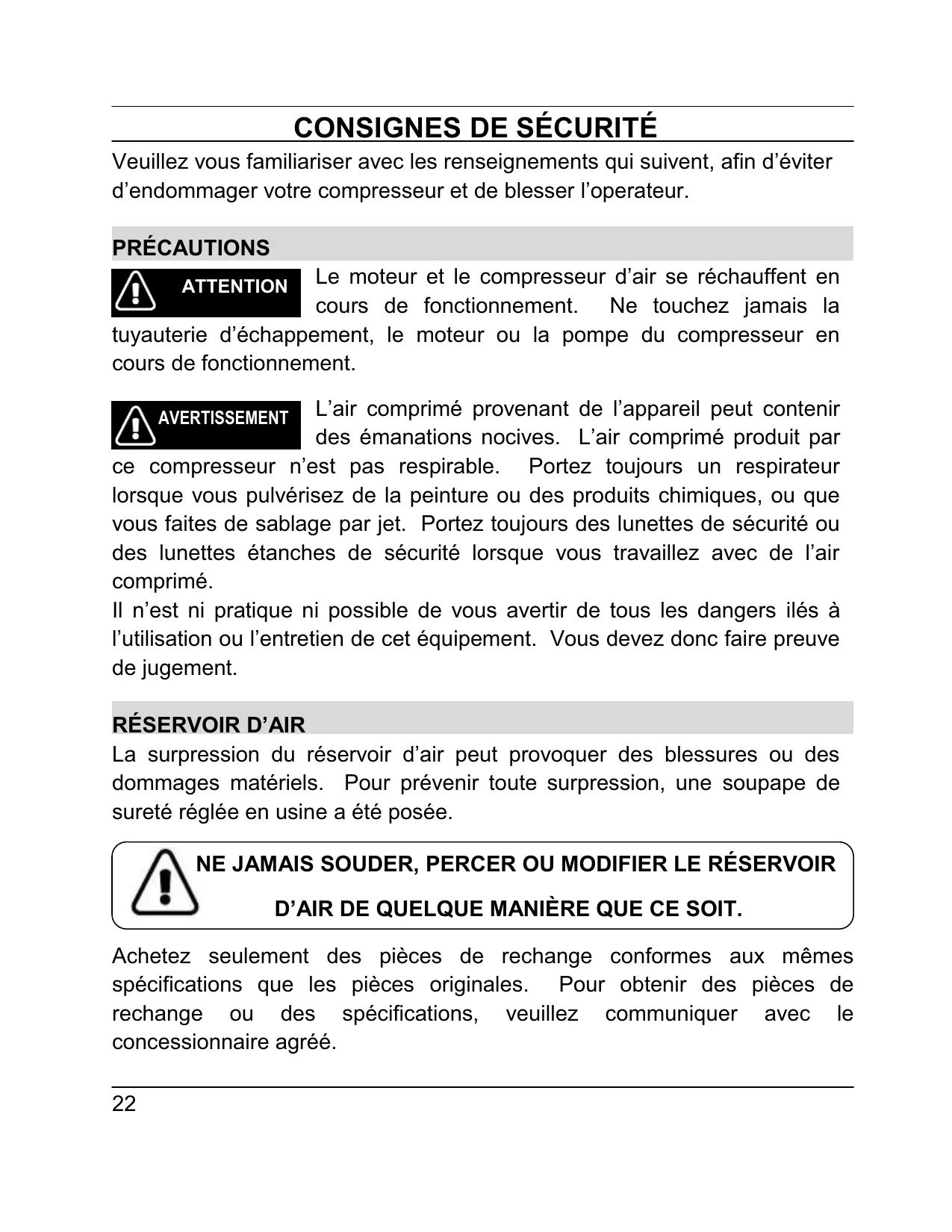 La surpression du réservoir d’air peut provoquer des blessures ou des dommages matériels. Pour prévenir toute surpression, une soupape de sureté réglée en usine a été posée. NE JAMAIS SOUDER, PERCER OU MODIFIER LE RÉSERVOIR D’AIR DE QUELQUE MANIÈRE QUE CE SOIT. Achetez seulement des pièces de rechange conformes aux mêmes spécifications que les pièces originales. Pour obtenir des pièces de rechange ou des spécifications, veuillez communiquer avec le concessionnaire agréé.
