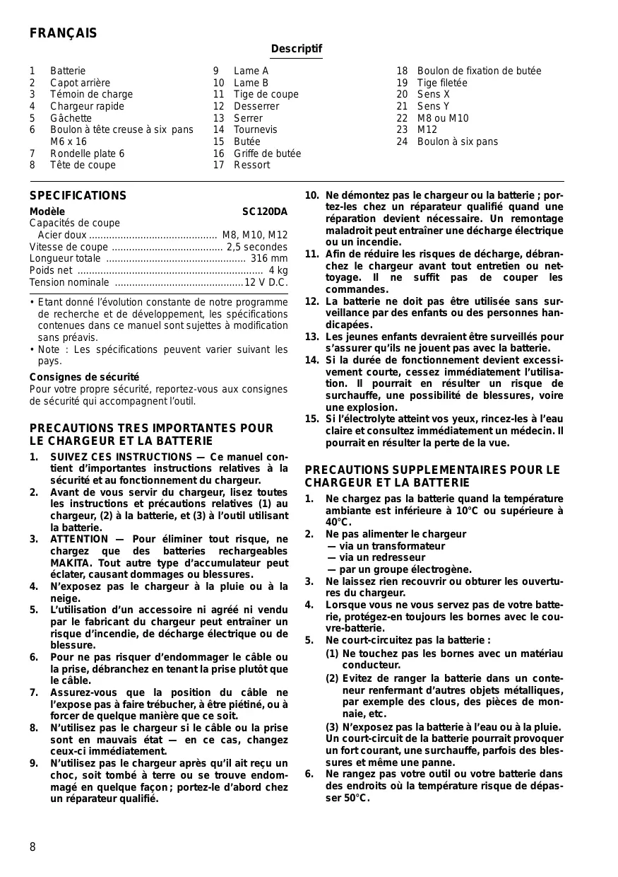 Lame A Lame B Tige de coupe Desserrer Serrer Tournevis Butée Griffe de butée Ressort SPECIFICATIONS Modèle SC120DA Capacités de coupe Acier doux ............................................. M8, M10, M12 Vitesse de coupe ....................................... 2,5 secondes Longueur totale ................................................. 316 mm Poids net ................................................................. 4 kg Tension nominale ............................................. 12 V D.C.