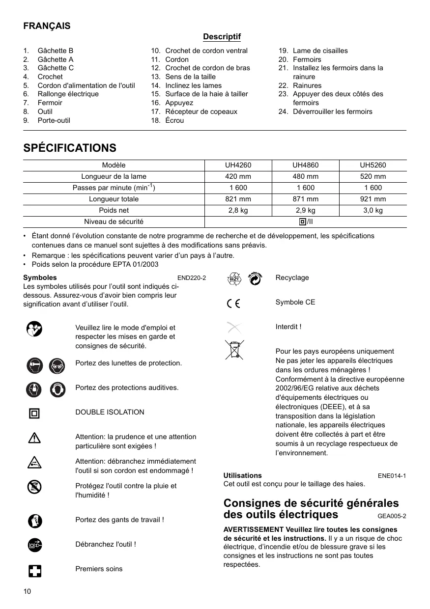 • Crochet de cordon ventral • Crochet de cordon de bras DÉCLARATION DE CONFORMITÉ CE ENH020-1 Le soussigné, Kato, tel qu'autorisé, déclare que les outils MAKITA, TYPE : UH4260, UH4860, UH5260 sont conformes aux normes et exigences en matière de sécurité des directives concernées de l'U.E. : Directive de l'U.E. relative aux machines 98/37/CE, Émission de bruit 2000/14/CE, Directive de l'U.E. relative à la compatibilité électromagnétique 2004/108/CE. Les exigences des directives de l'U.E. indiquées ci-dessus ont été remplies principalement sur la base des normes suivantes : EN60745-2-15, EN 55014, EN61000. La procédure d'évaluation de la conformité 2000/14/CE a été réalisée conformément à l'Annexe V. Le niveau de pression sonore mesuré (LpA) est 87,6 dB (A). Le niveau de puissance sonore (Lwa) mesuré est 93 dB (A). Le niveau de puissance sonore garanti est 96 dB (A). Vibration La valeur totale de vibration (somme du vecteur triaxial) déterminée selon EN60745-2-15 : Émission des vibrations (ah, D) : 6,7 m/s2 Incertitude (K) : 1,5 m/s2 CE 2008