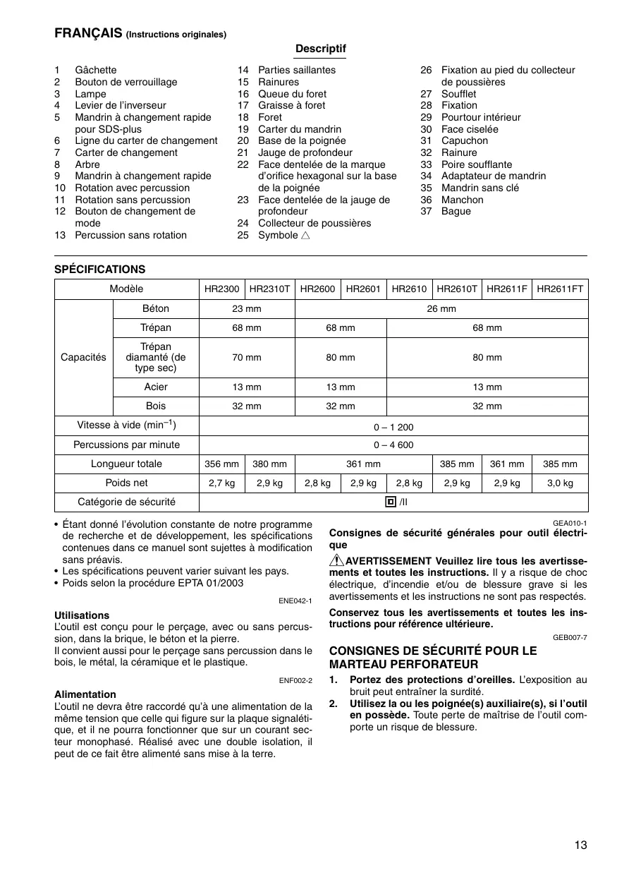 MODE D'EMPLOI HR2610T MAKITA