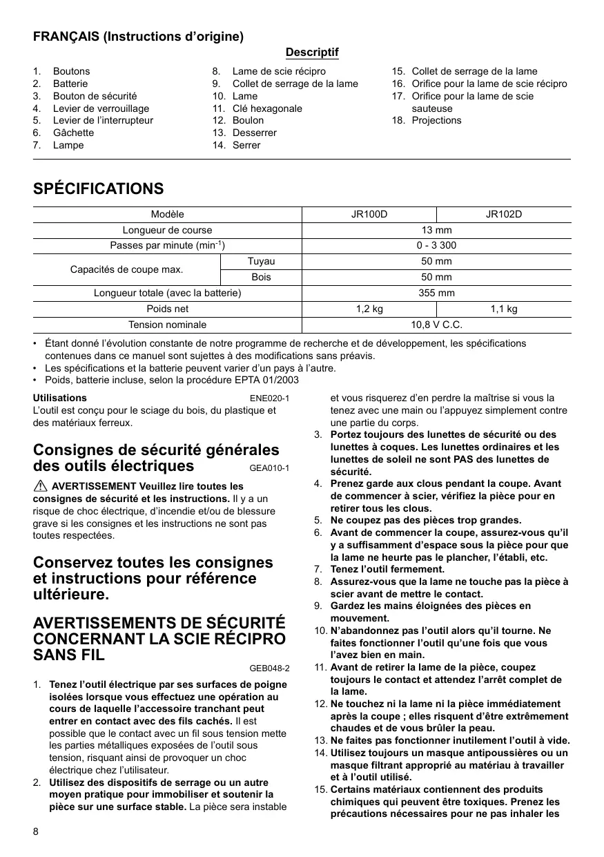 • Les spécifications et la batterie peuvent varier d’un pays à l’autre. • Poids, batterie incluse, selon la procédure EPTA 01/2003 Utilisations ENE020-1 L’outil est conçu pour le sciage du bois, du plastique et des matériaux ferreux.